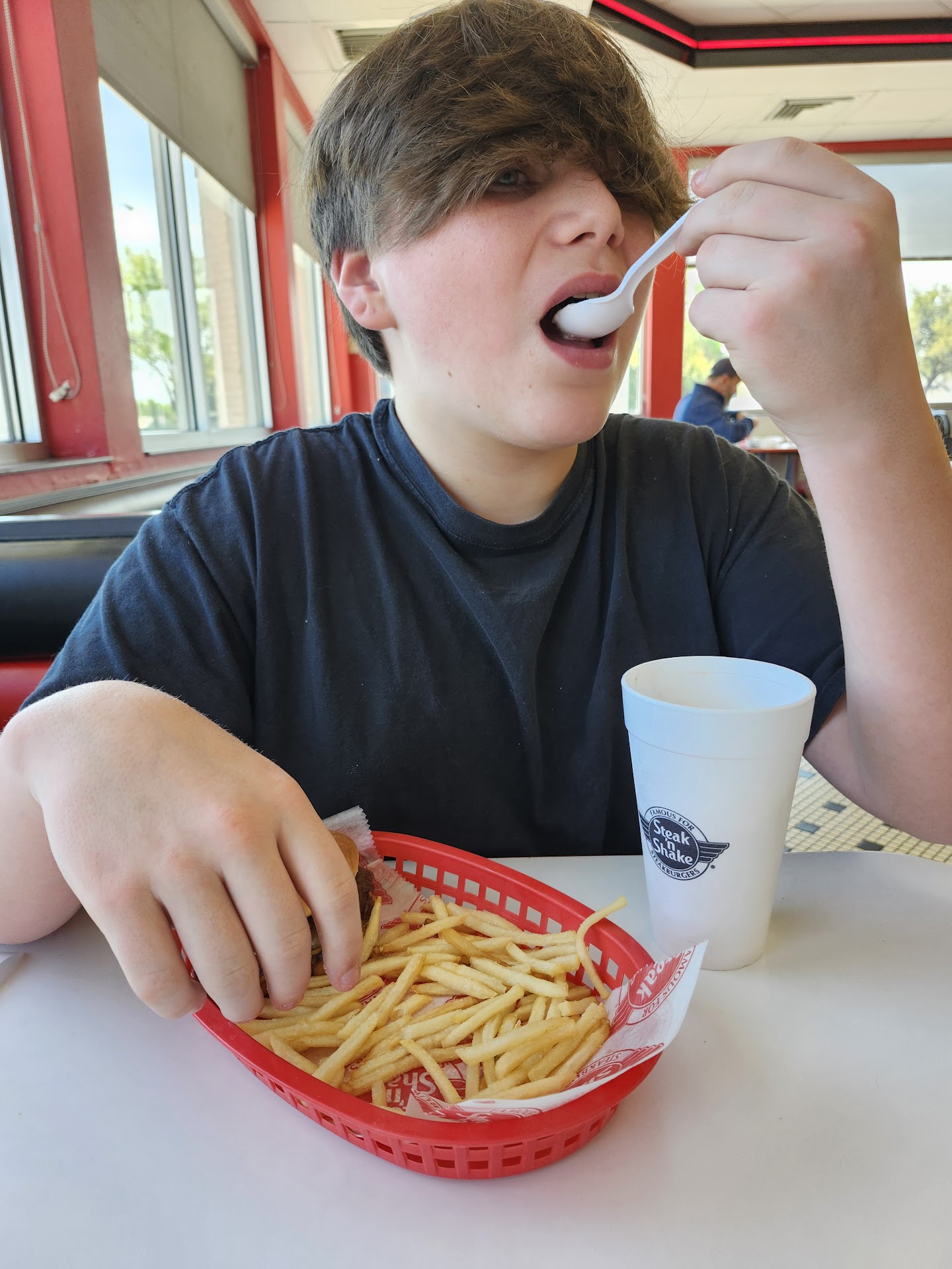 My second-grade son says: We both get to choose a restaurant each week. Fortunately, I always beg my mom to go to Steak and Shake. When I got there, I just sat down and ordered my food and drink. I got the drink, but I was getting bored because we had like a 55 minute wait. Once my mom got out of our seat to inform the waitress we had to go. The bad news is that they were out of taco salad ingredients. I kept on waiting and waiting and I was starting to say to my mom, "I'm going to take a rest until my food comes." But it was too loud and I couldn't just close my eyes. A kid and his parents who came after us got their food and we didn't. And then an old man who came before us finished his food and then left. I was wondering what was going on. I was starting to tell my mom we should leave, and soon enough, my mom started to agree with me. We started to write on a napkin saying that we were going to leave the restaurant because of their poor service. While we were writing the note, our food came. My mom had a strict talk with our waitress to talk to the manager to speed up the service. When we came up to pay, I discovered it was the manager's first day at Steak and Shake. Then we left and we went to my mom's rehearsal and we were fifteen minutes late! If you go to Steak and Shake, you may have to pay the price for waiting...
