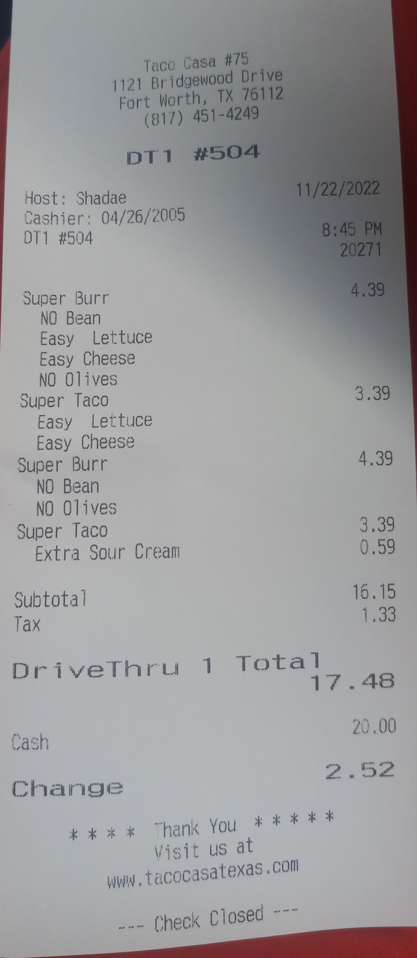 I ordered 2 super tacos and 2 super burritos. Both taco were STALE as hell. I tried to call management just to let them know so they stop using these old ones for other customers. The call send to voicemail 3x in an hour time frame so I’m writing this review for a few reasons.