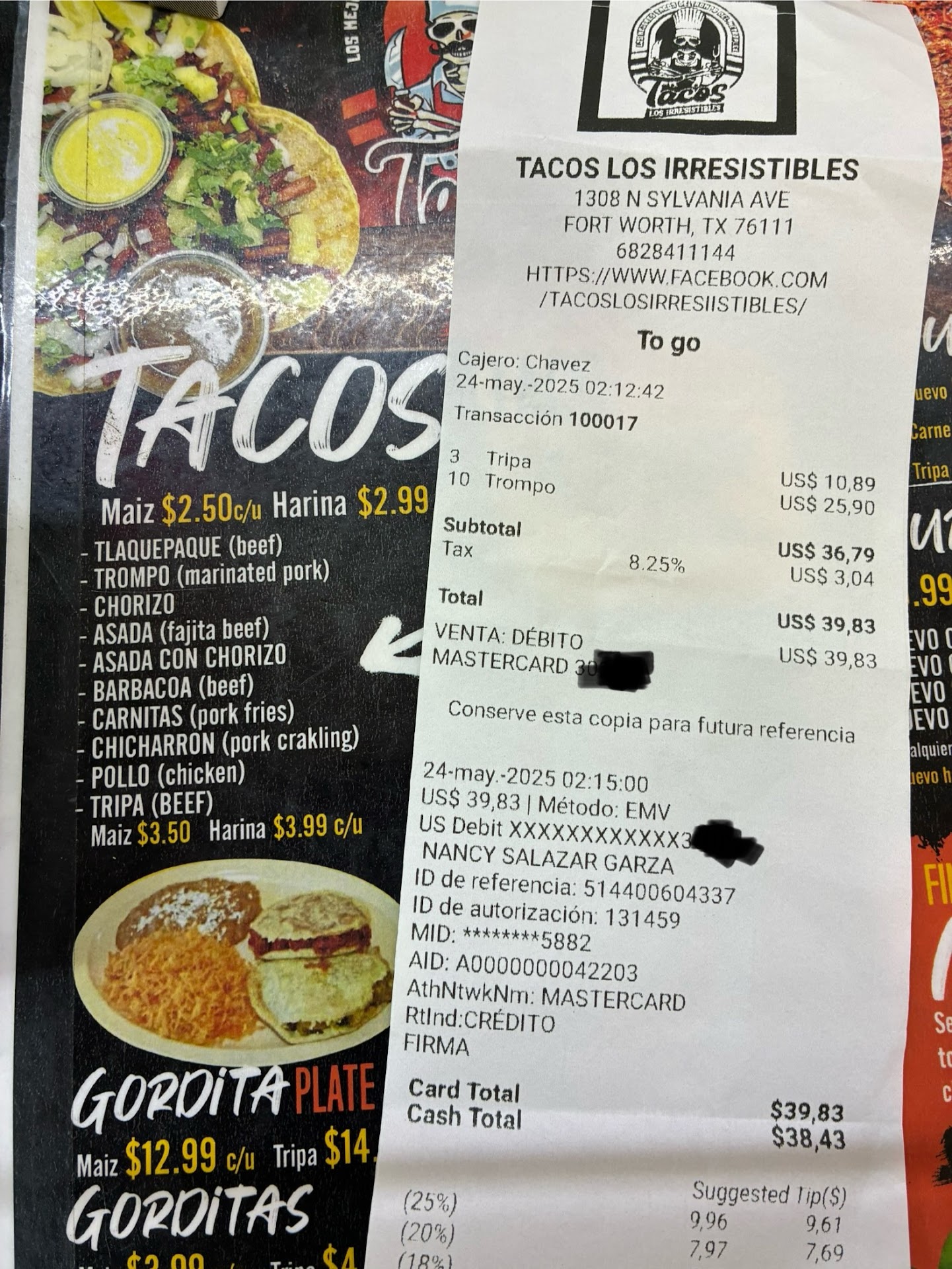 Read morePros takes debit cards, thankful they invested in 76111 area, the tortillas both flour and corn are good. Waitress is pleasant attitude & to look@, both sauces are good, green hotter than red but they need one that is super caliente. The food bar has cilantro, onions, peppers and limes to your liking. Place is clean and bright and the menu is not overwhelming. Cons everything is in Spanish only, paying by debit card takes a long time, the flavor of the meat is typical, nothing special, grilled onions need a little more grilling. Note: I'll be back again to try other things, large enough for small...