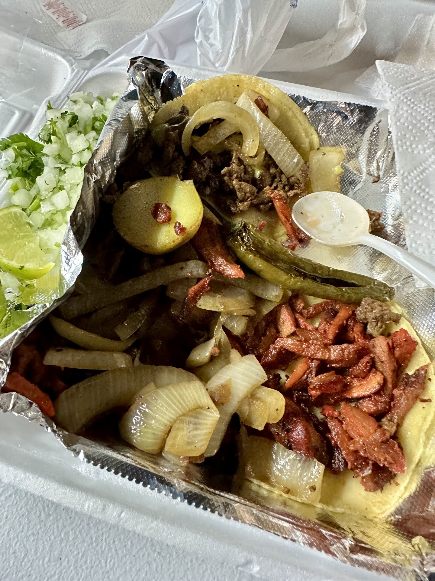 100% recommended. Few meat options which was honestly a bit of a turn-off for me before visiting but their meats are cooked very well. Tacos are served on delicious perfect corn tortillas, and salsas compliment perfectly. The papas asadas seem small, but the potato itself is already premixed with butter and then packed down, then loaded with cheese meat and drizzled with crema. Pretty filling. One of my new top favorite DFW taco spots. We got salsas, grilled onions, limes, cilantro and onion, all on the side and plenty...