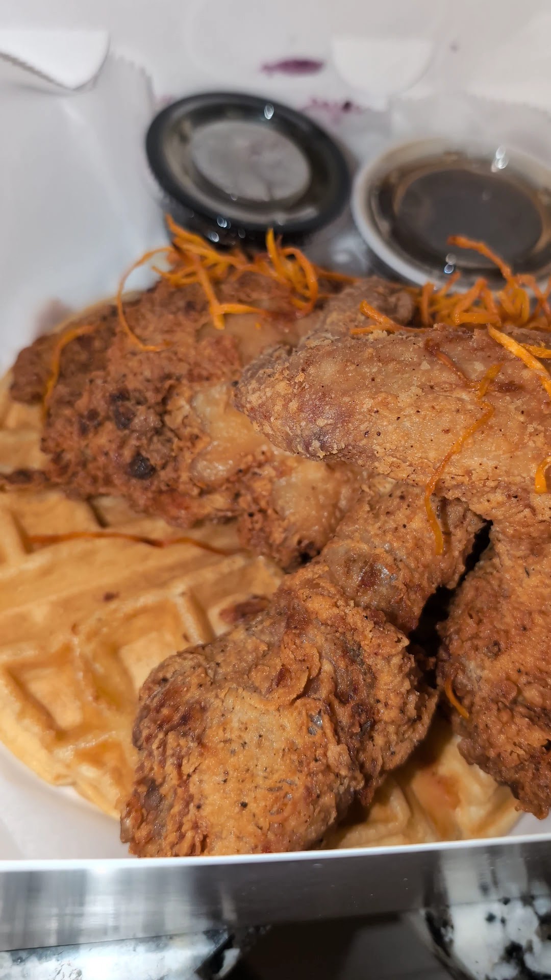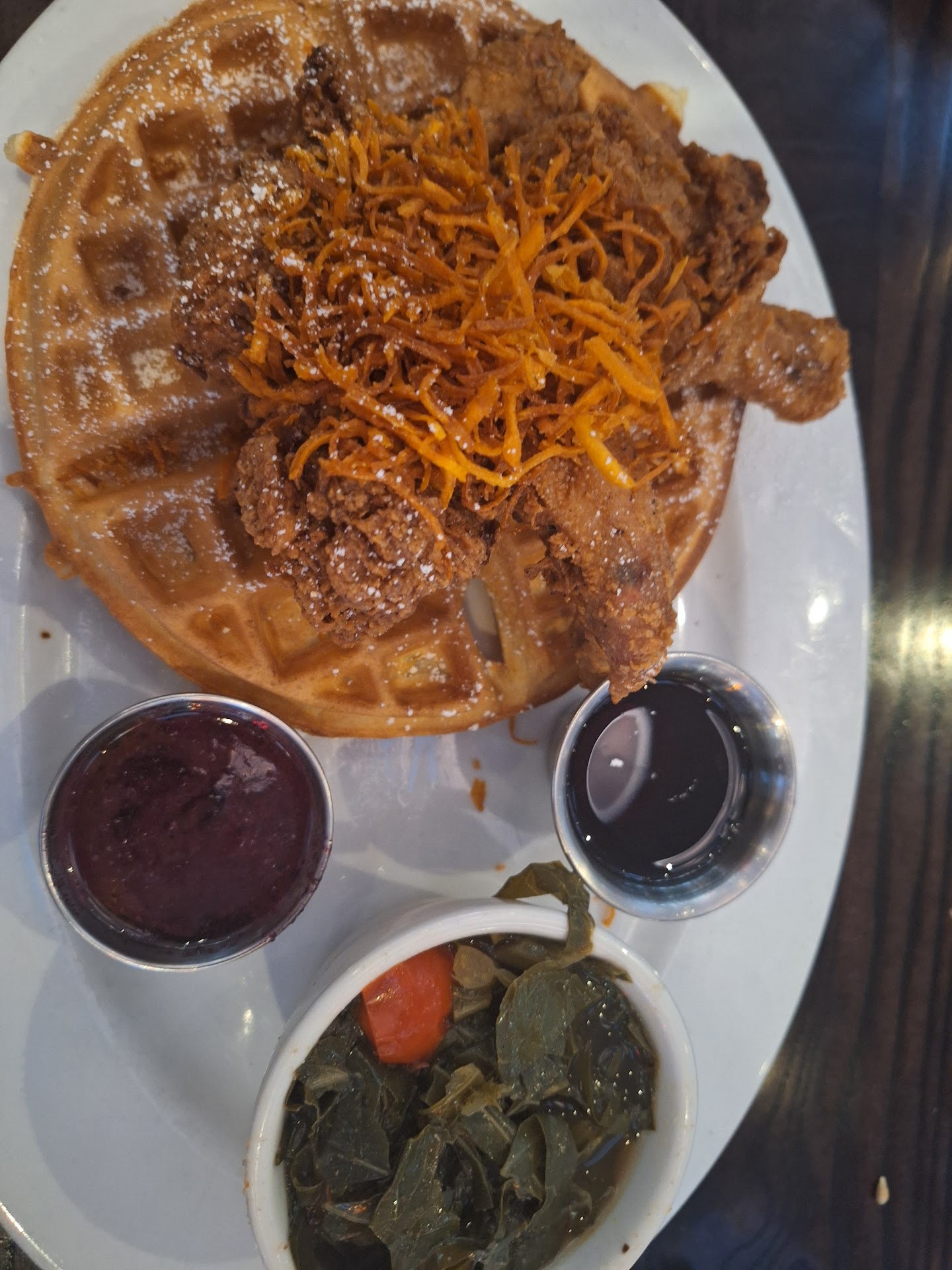 Read moreFIRST TIMER . So first the good things GREAT MUSIC FROM THE 60S plays throughout. I'm not from that eta just have an old soul. Next the chicken and waffles and greens. Well seasoned. Nice crunch. The chicken fried chicken with mashed potatoes was decent but the green beans had a lot of strings in it. Will I be back YES but only to try brunch. I got there just after 2p so they had just stopped brunch. Keep reading if you want to know what i suggest you avoid. Spinach dip very average. Definitely does not seem to be from scratch. Their sign and employees wear tshirts that say scratch made. Not sure what they define as scratch made. Sorry but tasted like something they squeeze from a bag or scoop out of a container that gets shipped in. The kettle chips served with it definitely seem house made but im not feeling that with spinach dip. The Flatbread the served with it saved the day. The sweet tea was weak. No brewed flavor. The shrimp and grits I sent back. Wouldn't recommend. The grits were terribly bland. Oh em gee. They're supposed to be jalepeno cheese grits. No cheese in sight so i inquired. Waitress said they blend it in the grits during the cooking. I guess that's why there's no cheese flavor. I was warned not to order the meatloaf. Menu Description sounded good but i was warned ahead of time that it's bland. I got the peach cobbler for dessert with ice cream. This was a total let down. If any reading this are peach cobbler fanatics like me don't waste your money. Crust was so bland. No cinnamon sugar taste and overall the peach filing wasn't very sweet at all. Even the vanilla bean ice cream was bland. Sigh. Not much vanilla flavor at all. I even took a couple bites without the cobblee and yea the vanilla flavor was barely...