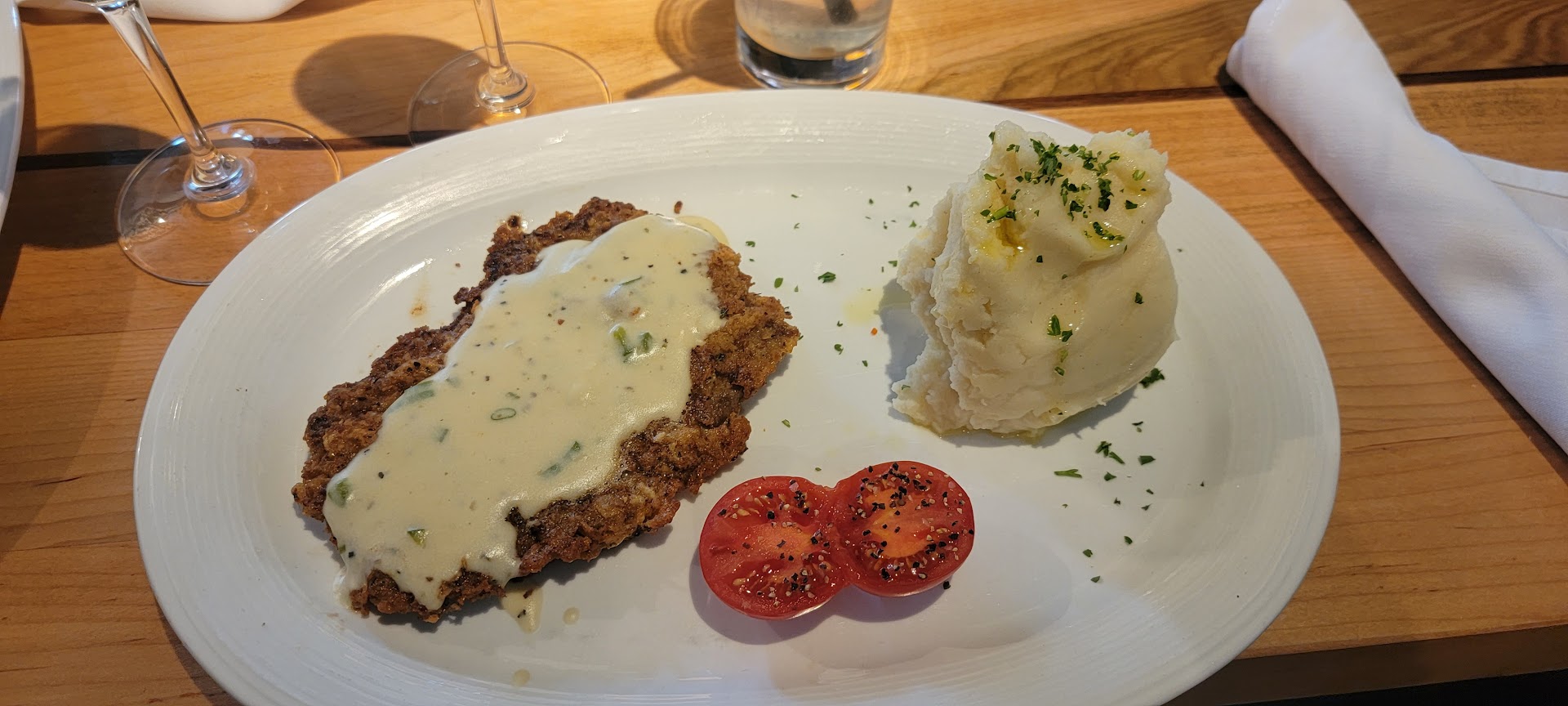 Food - The food was totally delicious! We recently went to see the movie "The Menu" came out in 2022 (the year I'm reviewing this). This is definitely a location that will engage your taste buds and your palette. My girlfriend got the steak cooked rare, and it was absolutely phenomenal. I do not eat my steaks rare at all (more of a medium - medium well guy), and I was devouring her steak. The flavor profile was crazy amazing. Check the word choice, there's a reason. I got the Pan Fried Steak (chicken fried steak type of meal) and it was absolutely phenomenal too! Also demolished my food. Everything is made from scratch, weighed, and properly prepared with fresh ingredients from that morning. This place is a foodies paradise.