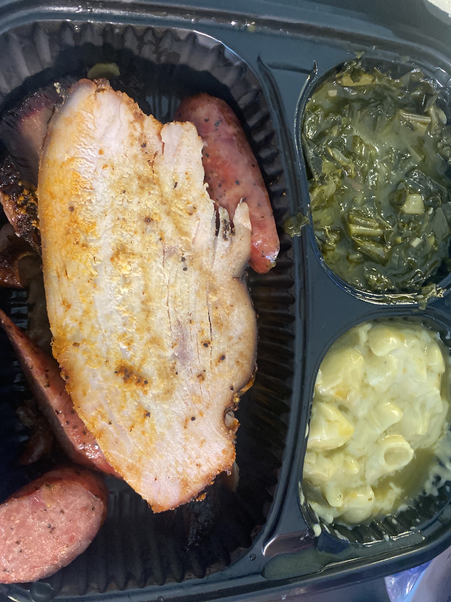 Ā Ā Ā Read moreI decided to give them a try and I am glad I did. I ordered a 3 meat plate - Sausage, lean brisket, turkey, Mac and chesss, and collard greens w/ a side of Serrano cornbread.