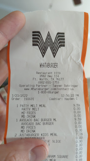 Read moreSo I’m not proud to say it but I’ve been to this whataburger many times over the years, and it this point I am losing hope I can ever get the right order. I used to work in haslet and I got to the point that I would drive to Roanoke for food during those hours because during the night you can expect to take up to 50 minutes to get your food, and that’s if they even get your order correct. I don’t think I’ve ever left the drive thru with everything my meal should come with. Multiple times I have bit into a burger and thought I bit a block of salt, I know you can get ocean water at sonic but if you want an ocean burger come here, get the salt of the sea on your tongue. Ask for no onions on a burger, you can bet they’ll be on there, but be wary that you might not have any cheese on it. I remember awhile ago my friends wanted to have lunch here, and when we got our meals our friend had a raw uncooked fry in his container, I don’t even know how that happens. I have met a few very nice workers here, but I have also sat in line listening to workers shout and curse and play around while people have been sitting for 15 minutes just to make an order. It’s very likely that if you pull up to the drive through intercoms no one will ever come on the speaker to take your order, best bet is to take a lap around and get back in line. Over all I only hope someone in charge try’s to make improvements to this place, it’s a great location but myself and many other people I know have no good words to say...