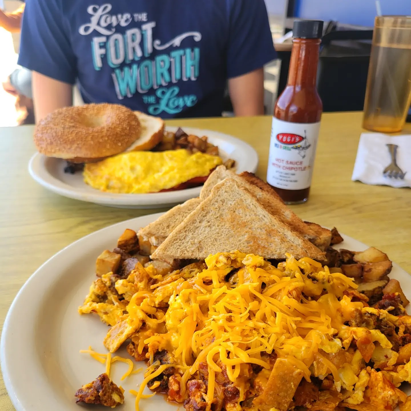 Well, I thought to myself, if this place is so great that it can cause Texans to abandon their usual polite and cheerful ways, the food must be truly spectacular. Sadly, it was not. It was merely ok - which suddenly made the whole experience inexcusable and inexplicable. South Arlington's Iris bagel company which i visited a couple of weeks earlier was a much better experience in terms of food and service...And finally what's with all the yoga pants? about half the customers and staff were dressed in skin tight latex...it was a little disconcerting. I felt a little added disappointed because it was my 14 year old step son's birthday breakfast...it should have been...