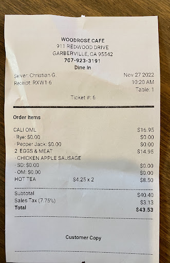 Read moreIf you're looking for a fantastic breakfast or lunch spot in Garberville, look no further than The Woodrose Cafe! This place is a true gem. From the moment I walked in, I was greeted by friendly service and a warm atmosphere.