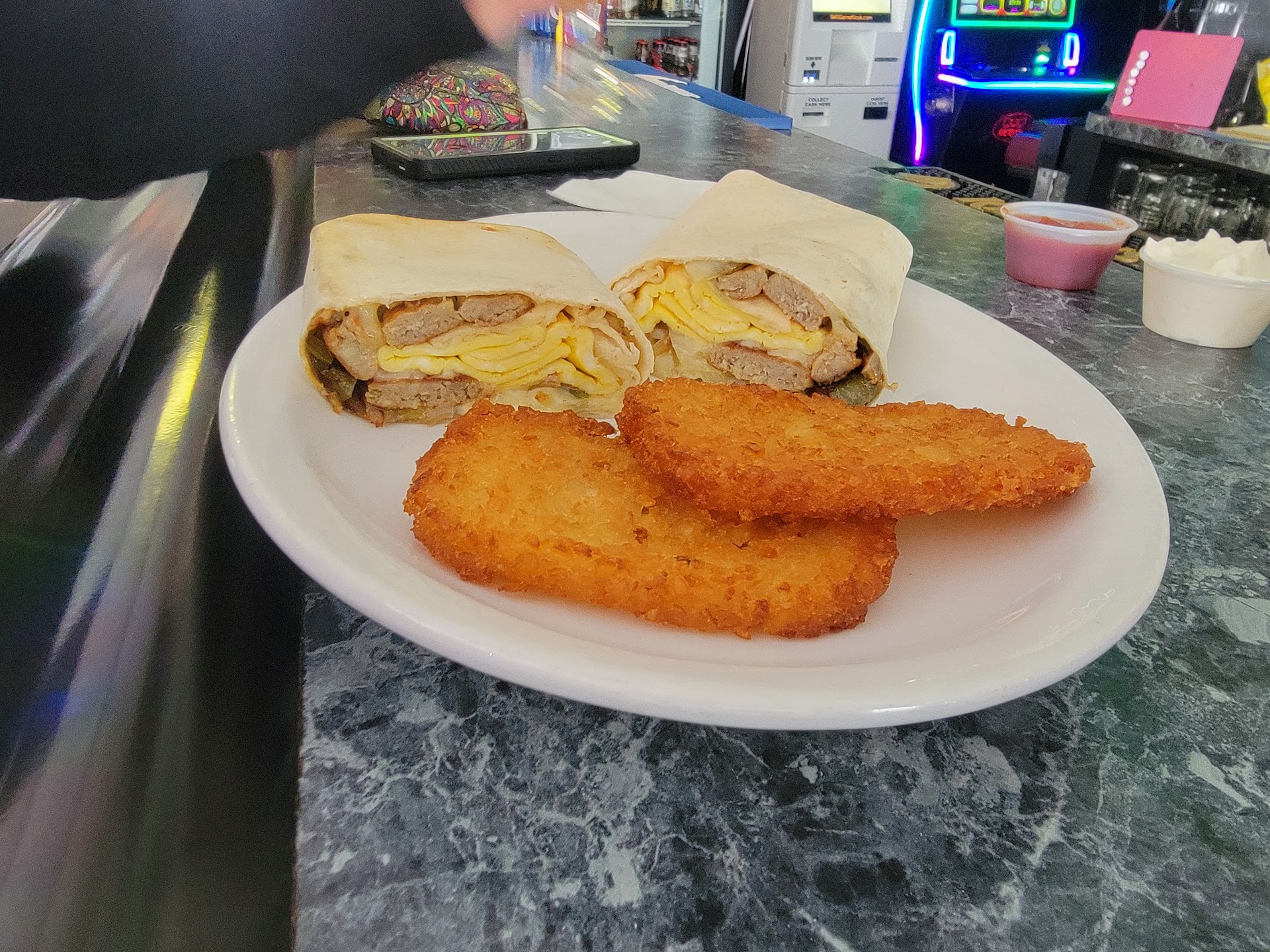 The breakfast wrap is insane....gargantuan and packed with meat, eggs, cheese, and served with a generous helping of very crispy hashbrowns.