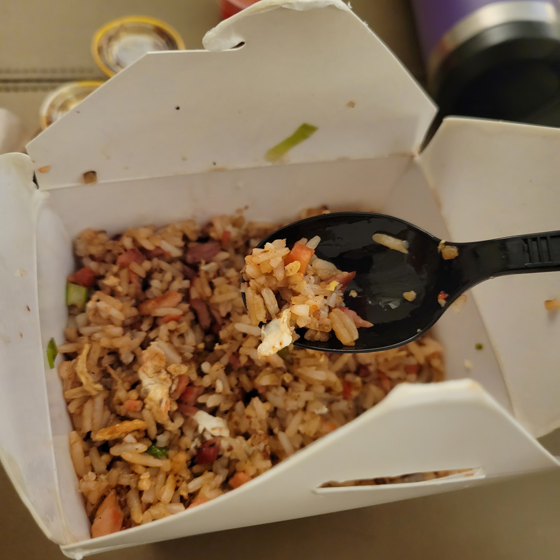I ordered a fried rice and 2 item combo for $12. The server heaped a massive scoop of the rice into my takeout box. Awesome! Then she went back and piled on another scoop. Amazing! Then she went in for the three-peat and I grew concerned.