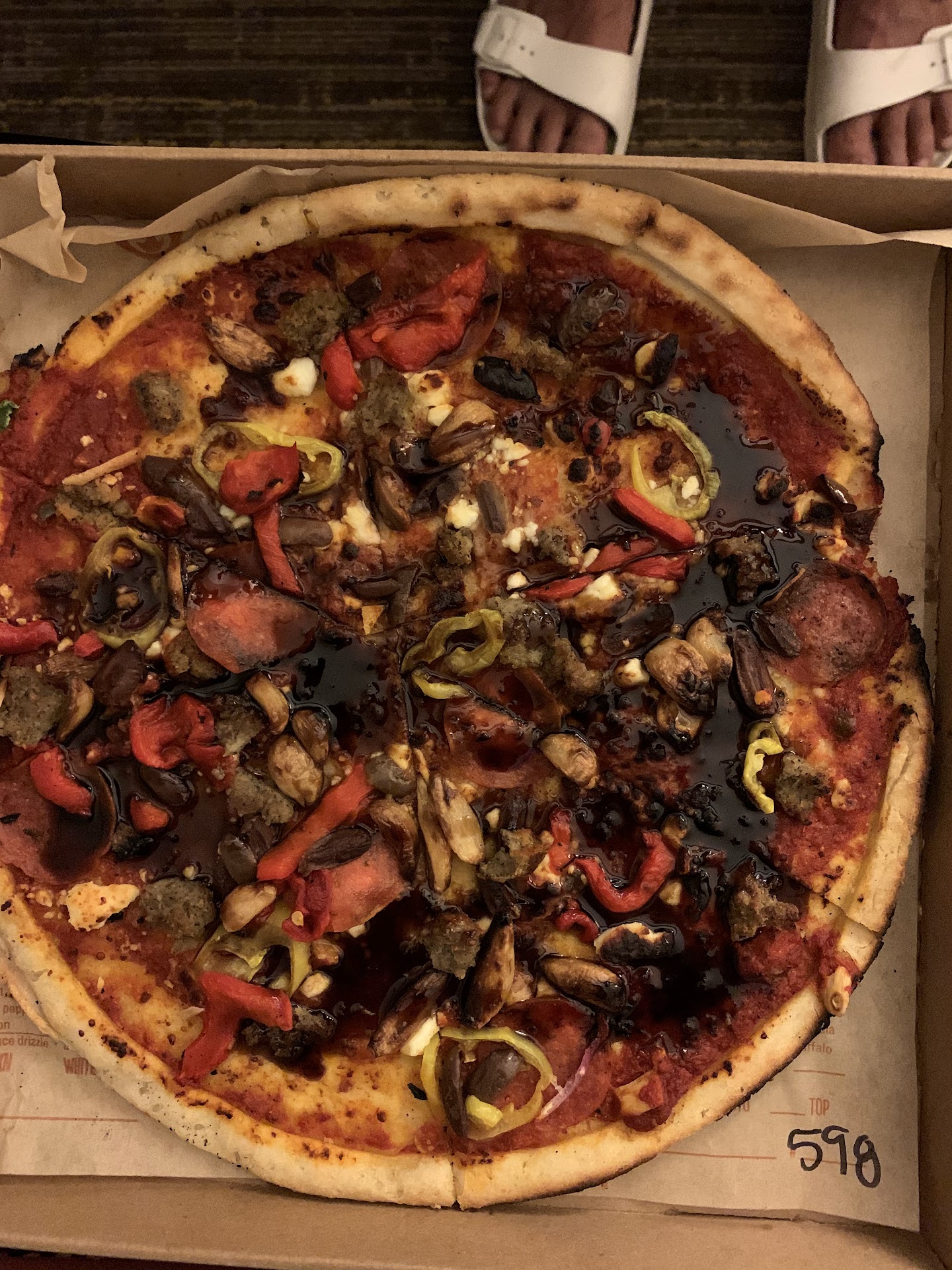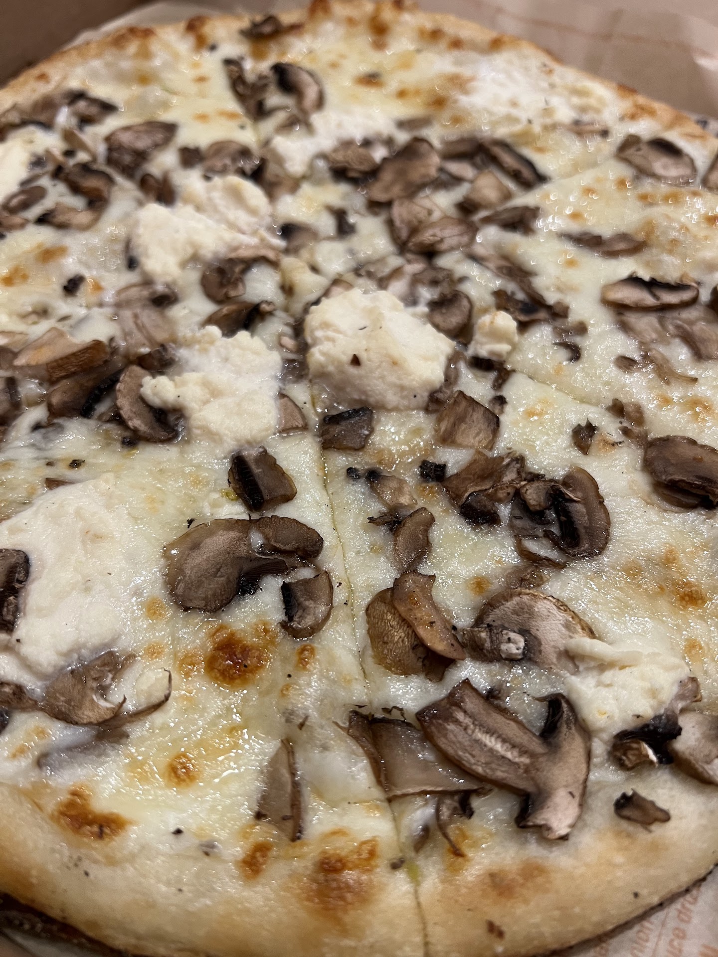 The crust was burnt along the edges. And, the keto crust tastes like a pretzel with no salt - very bland. My buddy ordered a pepperoni and mushroom pizza. I watched the pizza guy place it in the open oven.