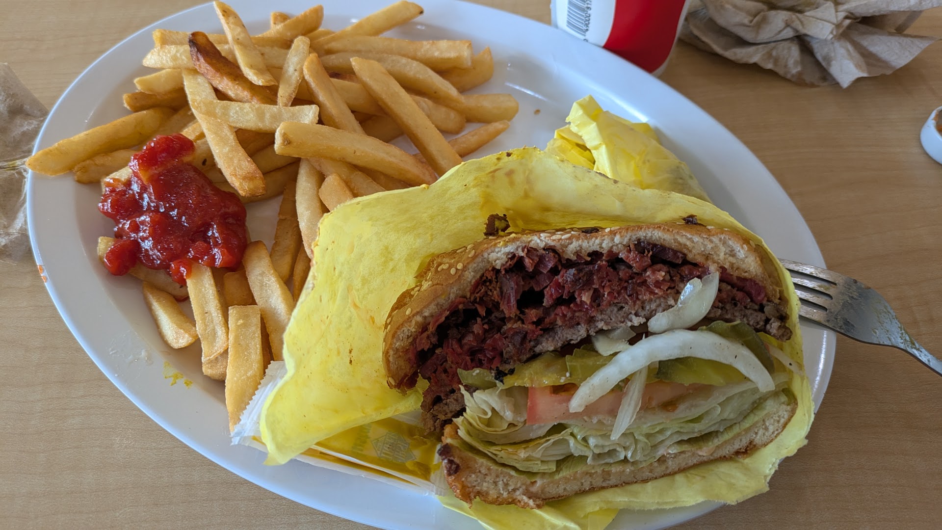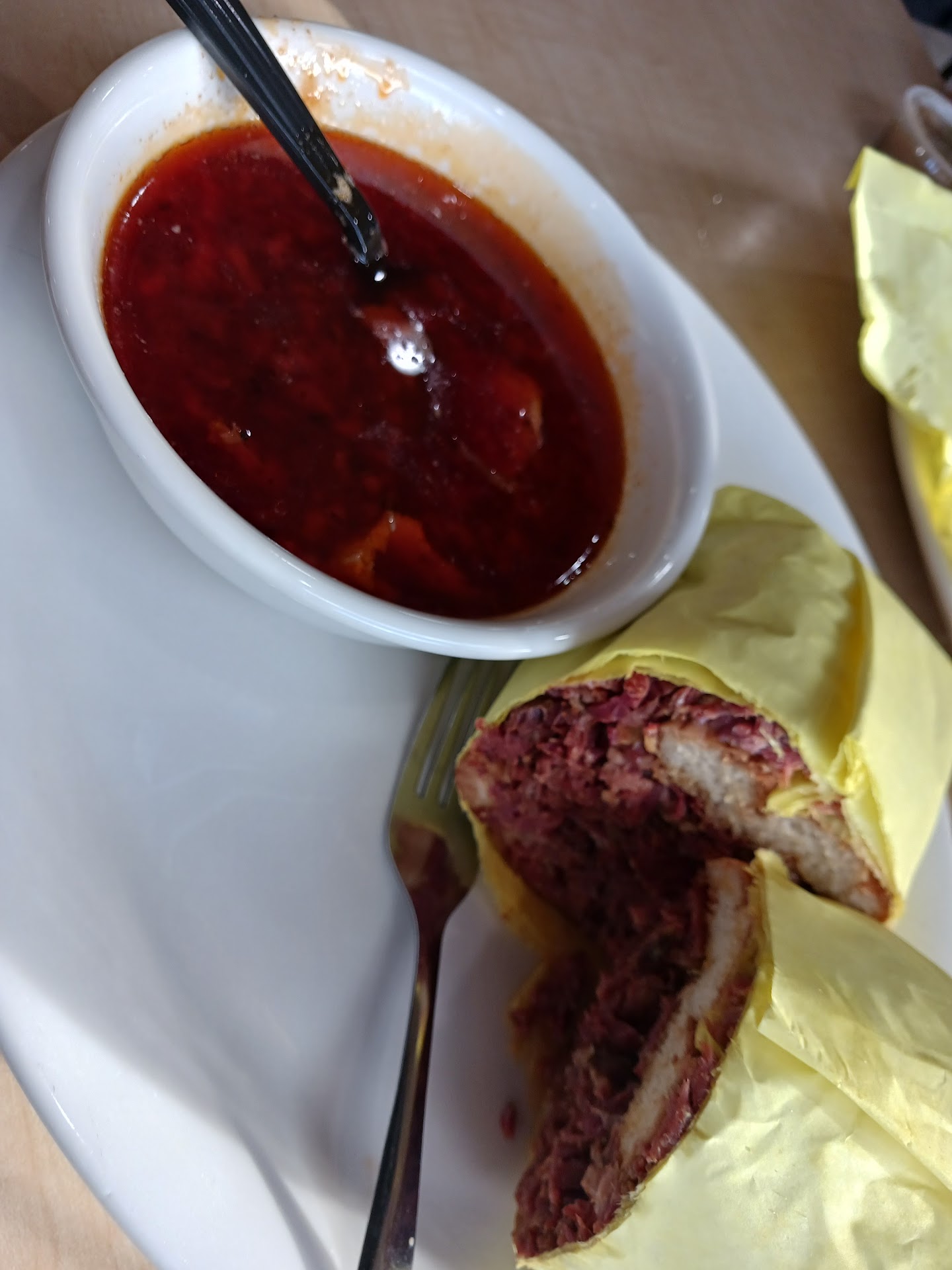 I know this place was gonna be hit or miss. Read the reviews. There was a time it was awesome. I really wanted a pastrami and ordered it. Was afraid it'd be dry, as for some ungodly reason, that's how they're made now. The counter girl offered a cup of au jus. Awesome. Got the chili cheese fries + onion + mustard. They were beautiful and tasted just as good as the presentation. Hub ordered a California burrito. Upon having the first bite of the pastrami, I could taste sour meat. I tried another bite in a different area of the sandwich and it was just the same, only this time I could smell it. So I looked closer at the meat and it looked like scraping from the pan. Pastrami crumbles. The meat should be in ribbons. I should've taken it back up to the counter, especially after spending $17.50 on it!! $17.50 for a pastrami sandwich?!! Much less a sour one? I wrapped half and took it home. Still couldn't eat it. What a waste.