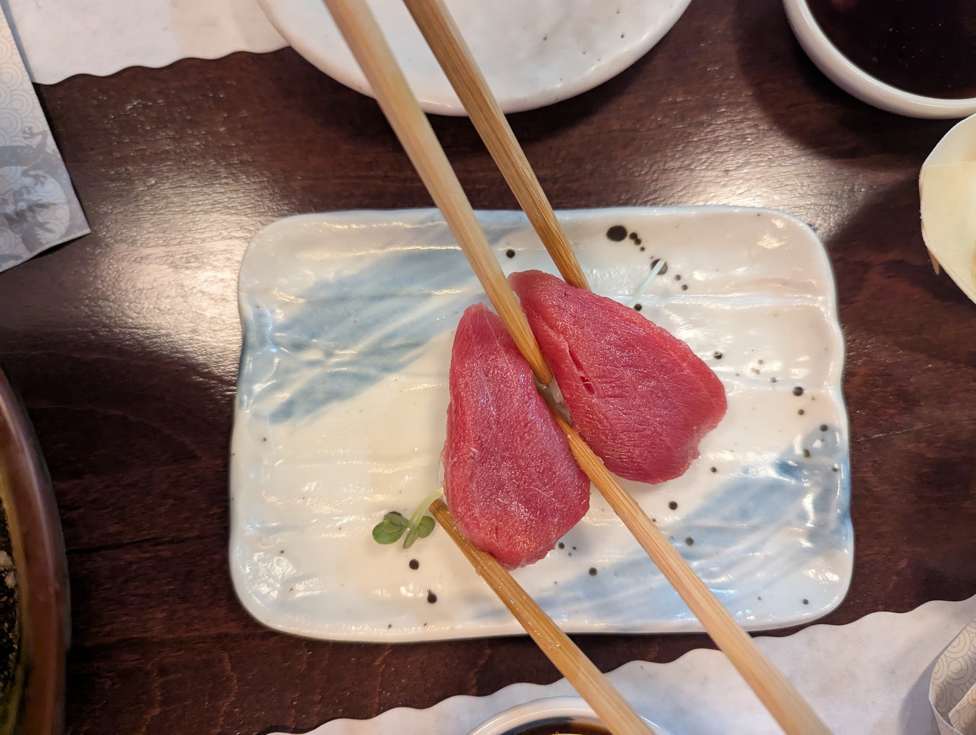 Definitely not Japanese owned. Which is fine, if the food and service is good. Not so much this place. The chairs were dirty, I needed to swipe it off with my hand. There was a chair blocking our seats that we couldnât pull out our chairs without moving the chair. They served rice on a small plate and not a rice bowl (which is offense to Japanese people, because in Japan, they give offerings of food / rice in small plates to the dead and leave it on their shrines.) A sushi restaurant doing this makes you question if they know anything about sushi or Japanese food and culture. The hot green tea tasted like detergent. Iâm not sure how you can mess up tea, but i guess itâs possible. We needed to ask for the tea twice, since they seemed to have forgot about it. When the tea came, two of the teas were lukewarm and one was piping hot. We ordered Sashimi, which wasnât bad. I just wondered why the sushi chef would forget to add the ginger and wasabi. Btw the sashimi was $69 just saying. Overall, it was funny how bad the experience was. Definitely wonât be back. 2 stars cuz the...