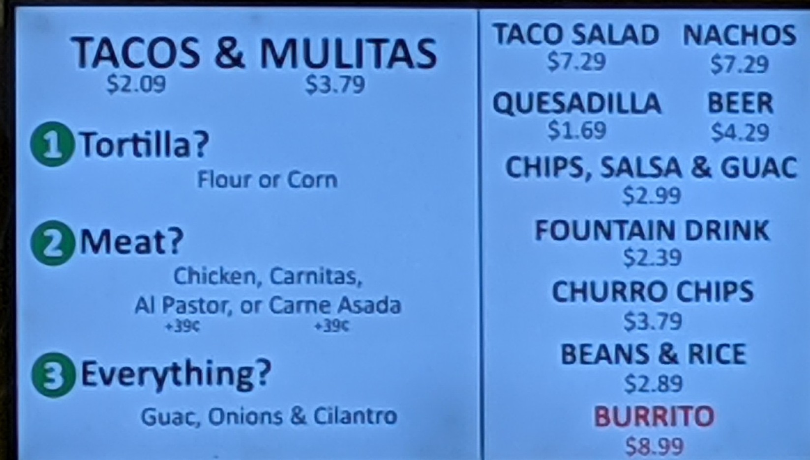 Read moreExpensive as hell to put it in perspective. 4 mulitas is $18. More expensive than 2 combos at in and out. More expensive than Tommy's for 2. More expensive than Baja fresh for 2. And more expensive thank Sharkeys in Irvine. You get less food for quadruple the price of any Mexican food joint. First and last time I'll ever eat here again. It's not even that great. In fact throwing away the food after spending $18 that didn't include chips or salsa was hard to accept. Lesson learned. Oh yeah they charge extra for meat, and there is no seasoning and it's just plain ol salt and a small taco sized...