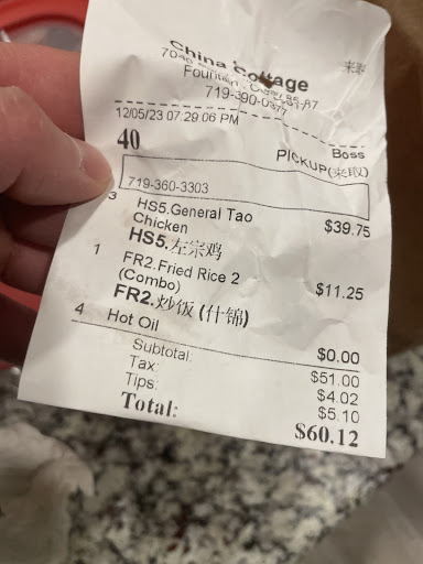 Read moreI placed an order that was over $40 and I had to return all of it! The shrimp fried rice was Old;rice was gummy, lo mein noodles were over cooked, fried rice was plain yellow rice with Nothing in it, no eggs, onions,vegetables etc. I have Never had fried rice with Nothing in it! Needless to say I promptly called to complain, manager wasn't there, so I personally returned food to restaurant. I spoke with whom I believe is manager/owner as be is looking at fu) containers of food I returned. When I pointed out the side of fried rice, he said that was "none of my business " Really? I'm spending money? I'm recording the whole exchange between us to cya in the event I had to dispute charge, once he realized. He did in fact refund my card, which I'm glad because I would have fought it. He saw the food, Never offered to make fresh, no apology and he has a nasty attitude. I would advise anyone who has Not eaten at China Cottage (Fountain, Co) there is a change of ownership and the quality of food has gone downhill! The previous owner was always Friendly and customer orientated. It saddens me that there is no longer a Chinese restaurant I can refer people to in this area,especially the...
