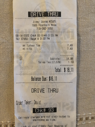Read moreI would give less than one star if I could. I Ordered my food and the person on the phone told me it would take 35-40 minutes due to baking new bread which I was totally fine with. I waited for an hour . Called again and the manager told me she would comp me $20 for the inconvenience and it would be delivered 20-30 minutes later. I proceeded to wait 40 minutes more and finally recieved my order after 1 hour and 42 minutes . The bread was completly hard and stale and to top it off, it was the end pieces to a loaf. I already waited an hour and 40 minutes and got an end stale piece sandwich. I called back and the manager offered money off in a future order; but I’d prefer not to eat burnt bread sandwiches that take almost 2 hours to receive. Get Pizza Hut or dominoes or fat boys pizza or even order China cottage or coal mine dragon. You’ll get better service and better food that isn’t burnt or stale . I would’ve rather asked my 6 year old to make me a sandwich than order jimmy johns in fountain and pay over & $20 for a burnt, end...