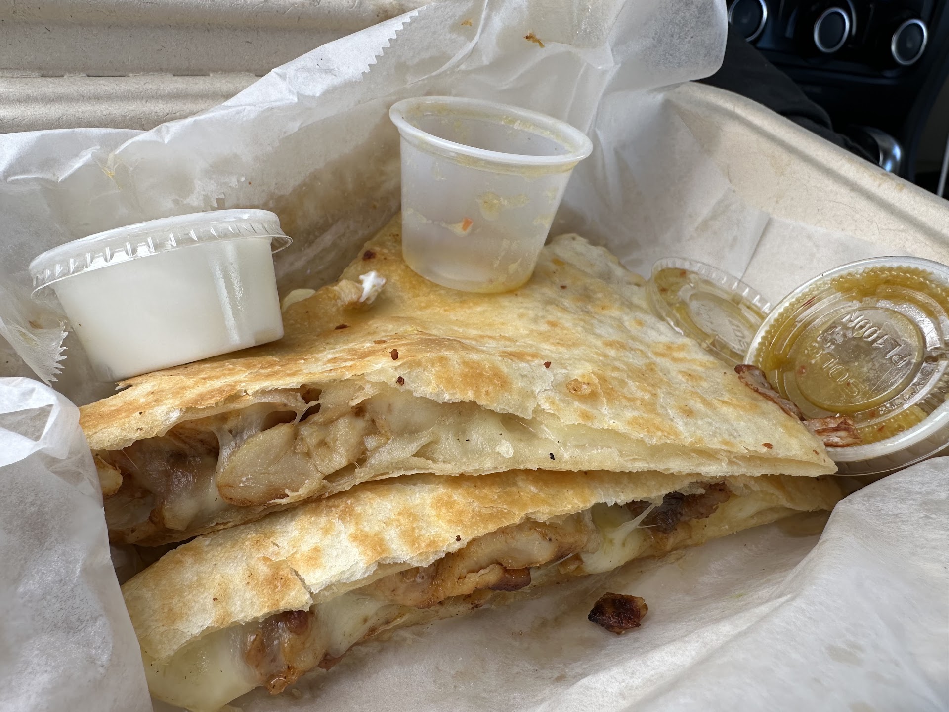 Read moreOnline ordering was seamless, order was ready in less than 15 minutes estimated time. Ordered 2 items only eaten 1 so far and wow!🤯 love this place already. Chicken quesadillas is a meal in itself for sure, generous with both the chicken and the cheese. Love the cheese not being cheddar or some other generic American thing, white salty cheeses always pair so much better with chicken than cheddar in my opinion. feta is always awesome with chicken too. Salsa is a good solid medium spice, I’ll ask if they have hotter options next time.