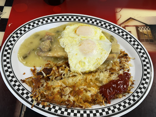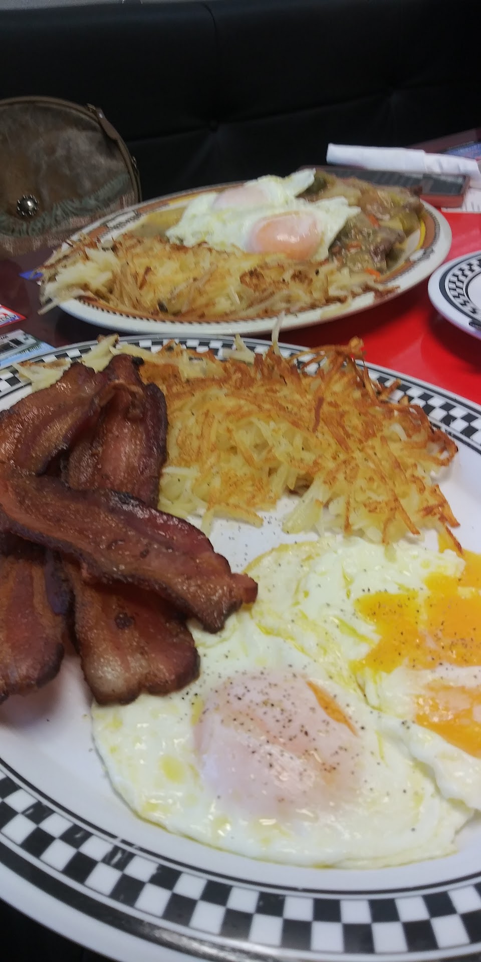 Across the street from Fountain Middle School, this unassuming exterior, where you find the bathrooms on the north end of the building, takes you into a true diner feel once inside. From black and white checkerboard floors to similar walls to a Coca-Cola fan and records adhered to the ceiling, your eyes are drawn from one thing to another. Marilyn Monroe and Elvis are hung all around. Overall this restaurant is clean and has menus that are made of a durable and easy to wipe martial, however, water staining on the tile ceiling can be found and the syrup container has plenty of wear and tear. From countertop seating to black upholstered booths to red or purple tabletops (or red tops with local advertisements and the restaurant logo) surrounded by wooden chairs with either red or blue seats, or black metal chairs with maroon seats/backs - this place is well suited for singles, families and larger parties. On the table you will always find: pepper, salt, jellies, fake and real sugar. Syrup (regular or sugar free), Ketchup and your choice of chili will be brought upon request.....45% vegetable oil whipped spread is brought with your pancake, turned upaide down on the stack -less chance it will fall during transport. An ATM and a few TVs can be found within the dining room. Service is friendly and food is quick! You can tell they have regulars! It was my first time here and they kindly brought me all 5 chili sauces to try, showing me mild to on fire. If you enjoy spicy, make sure you go for the hot green option. The waitresses seem to be true team players, but a little more communication or observation is key as they had moments were something was already completed for a table but the one assigned for the section was unaware. They wear (red or black) t-shirts with the restaurant logo. Enter the very sweet, rich and chocolaty hot chocolate with sky high whipped topping.....while too much for me, I'm glad I tried it, and others may enjoy. The scrambled eggs, took me home and the bacon seemed to either be locally purchased or at least higher quality, as the flavor and thickness...