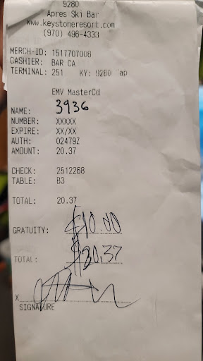 Read moreToo bad zero stars isn’t an option. I had the worst dining experience of my life here. We waited at least 2 hours for our food, we had our kids with us, didn’t have the option to walk out because it was the only place open and our kids were starving. Servers and manger were extremely rude for no reason. Messed up our order three times. Food was a 4 out of 10. Bartender was rude (ie 4 employees behind the bar, not busy with customers at all, bartender wouldn’t even look at me and I had to flag hin down after about 7min of waiting for a drink.) We were polite and left a tip anyway. DO NOT eat here and expect good service/good food. Go to any other restaurant in Keystone. Fast food would have been a better option. Impossible to get money back because they do not answer the phone/have any email. Boo to this spot. Vail Resorts… get your...