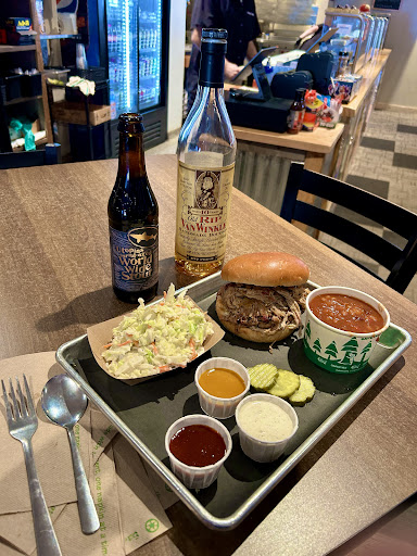 My wife had a similar order but went with the pulled pork sandwich with side and same drink choices ($15). The portion size of pork seemed to be pretty much the same, so maybe the sandwich meal is the way to go, unless you are going to try more than one of the meats offered. They do offer brisket, turkey, ribs, and sausage in addition to the pulled pork we tried. Overall a good and quick meal...
