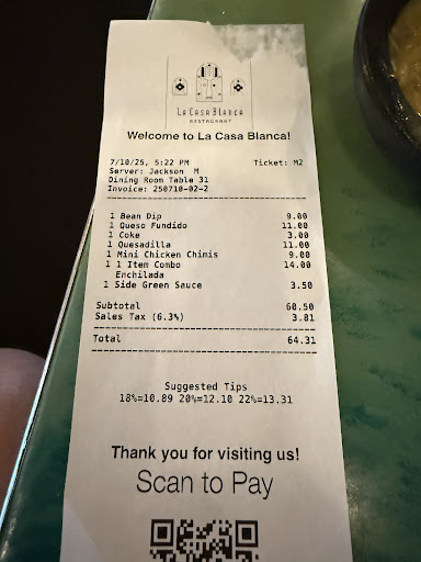 Read moreLa Casa Blanca is a wonderful restaurant that serves authentic Mexican food as well as a few other small selections. I went to lunch there on October 15th, 2015, and the service was impeccable. As soon as my party and I walked in, we were immediately greeted with a smile. We were asked the size of our party and were immediately shown to a booth to sit down, located near a window with an aesthetically pleasing view of the patio. The atmosphere of La Casa Blanca is best described as comforting. The style is friendly and entertaining without being garish or any kind of displeasing. The booths are comfortable and the bathrooms are well kept. The parking lot is gravel but located completely adjacent to the restaurant, and parking is ample for any size group of guests. The landscaping of the restaurant is well groomed and in accordance with the natural dressings of the desert, and it welcomes any local Arizonan seeking great nourishment. I ordered a Chile Verde Chimichanga, a combination of two of my favorite Mexican delicacies. My companion ordered a Chile Verde burrito with a side of rice and beans. These were prefaced by a complimentary bowl of chips with salsa and bean dip, which I highly commend but also recommend saving room for your hearty entree- most of which hover in price around eleven dollars or so. Drinks and dessert will cost a dining couple around seven dollars total, so the bill will come around twenty-eight dollars, just as the bill did for me and my companion. Our tip was four dollars, so our grand total came out to thirty two dollars. For a three course meal and drinks, the price is extremely competitive and really proves a quality meal can be affordable. Our overall experience at La Casa Blanca was amazing, and is all owed to an incredible wait staff that made our dining experience what it was. They were quick with the food and with the bill and were very kind in their exchanges with all diners. As we left, one employee thanked us for coming with a great big smile and the image still...