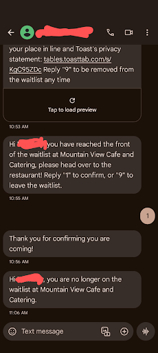 Me: Sorry but the only message I received said I was first in line, not that my table was ready. I sent the text to confirm I was "coming" when I was actually here.