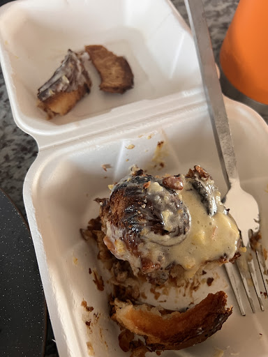 This was my first time checking out Moxie. I was really excited to try the cinnamon rolls because they had great reviews and the girl working really sold me on them so I got one for my partner and one for me. Disappointed when I got home as I found they were both burnt almost all the way through. You can see in the pictures they’re basically black but just covered with icing. I think this must’ve just been a bad day but if the item is over baked to this extent it shouldn’t be sold.