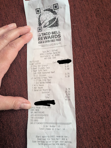 Read moreI've been to this location multiple times and this is the 1st time I've heard or seen Thomas B, the drive threw cashier. He didn't hear me correctly and he got my order wrong, I corrected my order and he says "you need to be specific" . I said "I was being specific ordering the regular chaplupa box with a Pepsi". I then pulled up to the window and he's taking a order from the next customer being rude and snappy to them too. He was finished and said to his co-worker that people today are awful. I looked at him and said he was being rude to the customers, he then said "I'm the best so whatever, you Scottsdale people are rude" he kept running his mouth at me so his coworker shut the window since my food wasn't ready yet. When I left, I called to get his name, the gal who answered didn't want to give me his name so she put a mgr on the phone. I expressed how rude and disrespectful Thomas was and all she said was " sorry, thomas is one of our best cashiers" I told her that it's not ok to treat others with such disrespect. I can't believe that a business allows this behavior. I will not be coming back. Thomas had no right to put me in a category like he did, I don't even live in Scottsdale but for him to even act like this especially when he's working and Taco Bell to allow it, I'm done with this Taco Bell and will be spreading the word. Obviously Thomas is a very angry man, hopefully one day he...