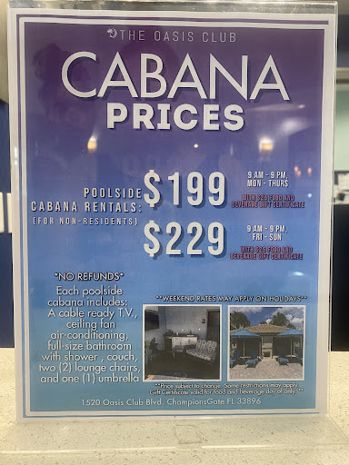 This is a Clubhouse and Waterpark in a Community full of Vacation Home Rentals. The Clubhouse has a lobby, a restaurant with bar, a small theater for movies, an event room, restrooms, a cash arcade, a gym with workout equipment, and a sundries gift shop. The Waterpark (FREE to guests of rentals) has a nice kids splash pool area, a large main pool approx 4 ft (at its deepest), a lazy river, cabanas (for rent), tables, chairs, lounge chairs, pool rings a snack shop and a bar. Bring a towel as they are NOT provided and the ones for sale are extremely poor quality and are quite pricey! It’s conveniently located in the neighborhood for guests and residents, however, NO outside food and only store bought “sealed” water bottles are permitted onto the property. There is a shuttle service that the community offers (FREE of charge) to get back and forth from the vacation rentals to the club. The Cabanas are air conditioned with a bathroom, a couch, side table and small wall mounted TV on a painted cement floor. They are currently $199. - $229. Per day dependent upon the day you rent. They do have an upgrade option that includes a few extras, but in my opinion is completely overpriced and not worth it for $89. If there’s a storm within 7 miles of the property with thunder and/or lightning you will be evacuated from the cabana and there is absolutely no refund. The food is pricy and not that good. The service on the pool floor and in the cabanas is unreliable, however, the staff are friendly. The crowd was made up of mixed ages and races everyone was quite friendly, there was music going, the lazy river is about 3ft deep and the tubes to float on there are at no charge. All In All this place is 100% overrated and extremely expensive. We spent almost $500 within the 1st hour there and we’re there for less than 2.5 hours due to poor weather.