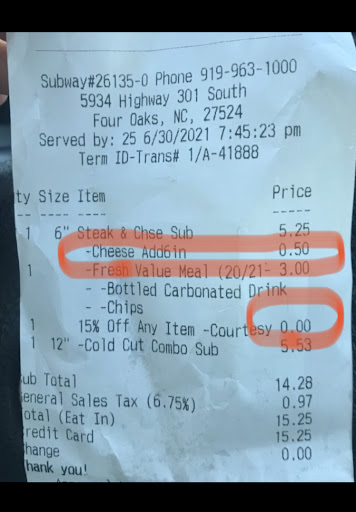 I hate leaving this place a negative review considering my husband and I were frequent customers. Unfortunately, we will not be back. Firstly, I ordered a 6 inch steak & cheese. I was charged .50 for cheese on my receipt and didnât have any extra cheeses added. Secondly I work in the healthcare field and was pleasantly surprised to see they offer 15% off to healthcare workers with a valid ID. THIS IS A SCAM! As you can clearly see on my receipt there was no discount given. When I asked the staff member how this couldâve happened they claimed I was given a discount even though it didnât show and were unsure about the cheese charge. So when I asked for my .50 refund for the cheese she told me âthey were unable to provide a refund for just that.â What a joke! In reality itâs not the .50 cheese or the discount. ITâS THE PRINCIPLE! Who knows how many others youâve charged extra money, or acted like youâve given a discount to when in...