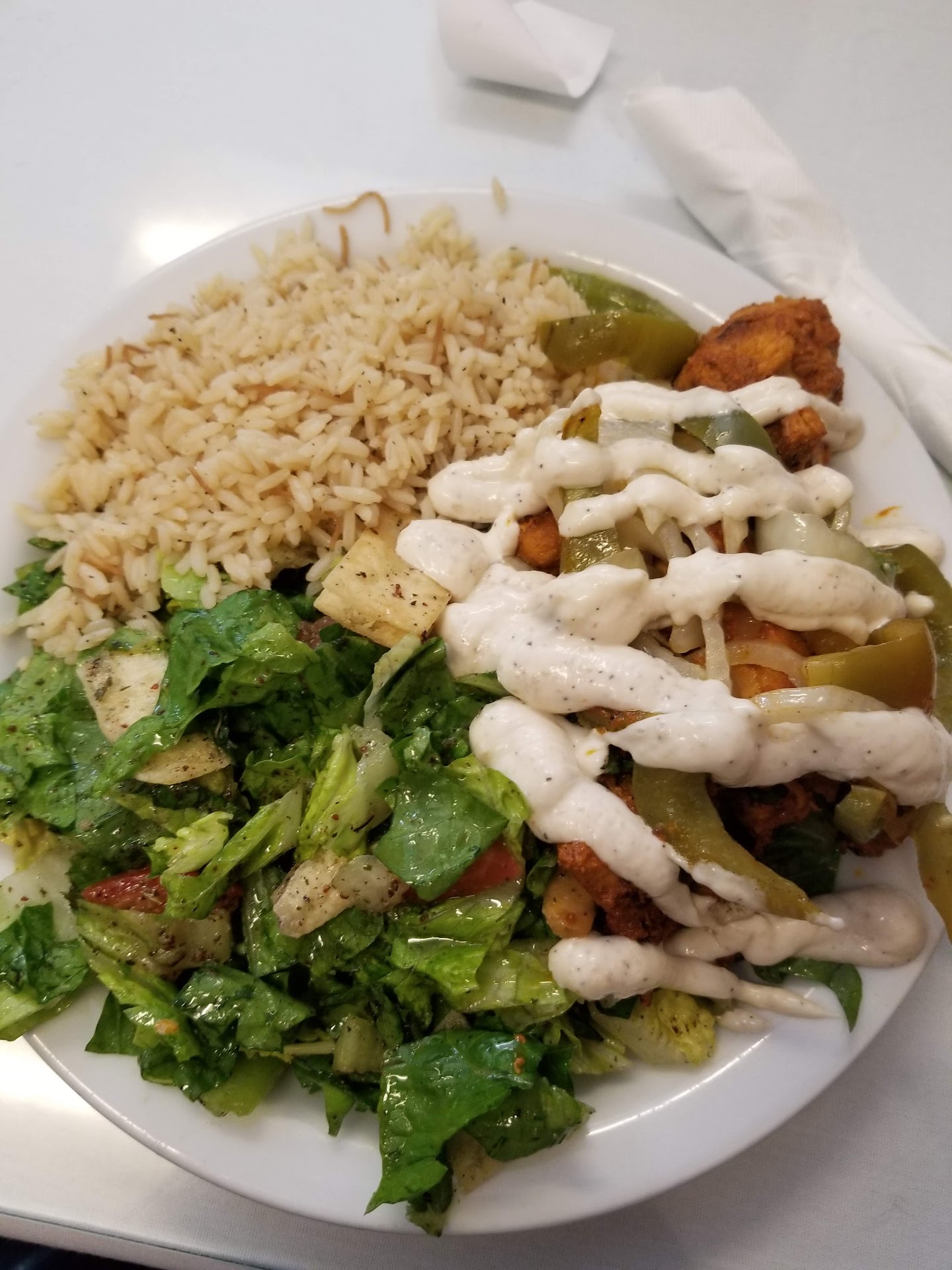 Read moreThis is the second time trying this place. Some dishes were order on both visits and they weren’t the same. Were not made the same way and weren’t the same portions as far as the proteins. The first time the chicken was dry and the lamb and beef were good but this time the beef was dry and the chicken was good. The difference in same dish had differ portions of protein and the salads were made different. This time they put what looked like fried pit bread on top of our salads. Why would I want fried bread o. Top of my salad? The Kabob city bowl only had four small pieces of chicken, it was mostly lettuce. All the salads we had were mostly lettuce and that fried pieces of bred on top. One of the dishes I believe should have came with garlic sauce and did t so we asked for it and they charged us for it. We order the hummus appetizer and it only came with one bread. We had to pay for each extra bread. We spent over $100 and we were not pleased. After two tries we wi t be back. Our plates were mostly rice and lettuce Not happy for the amount of...