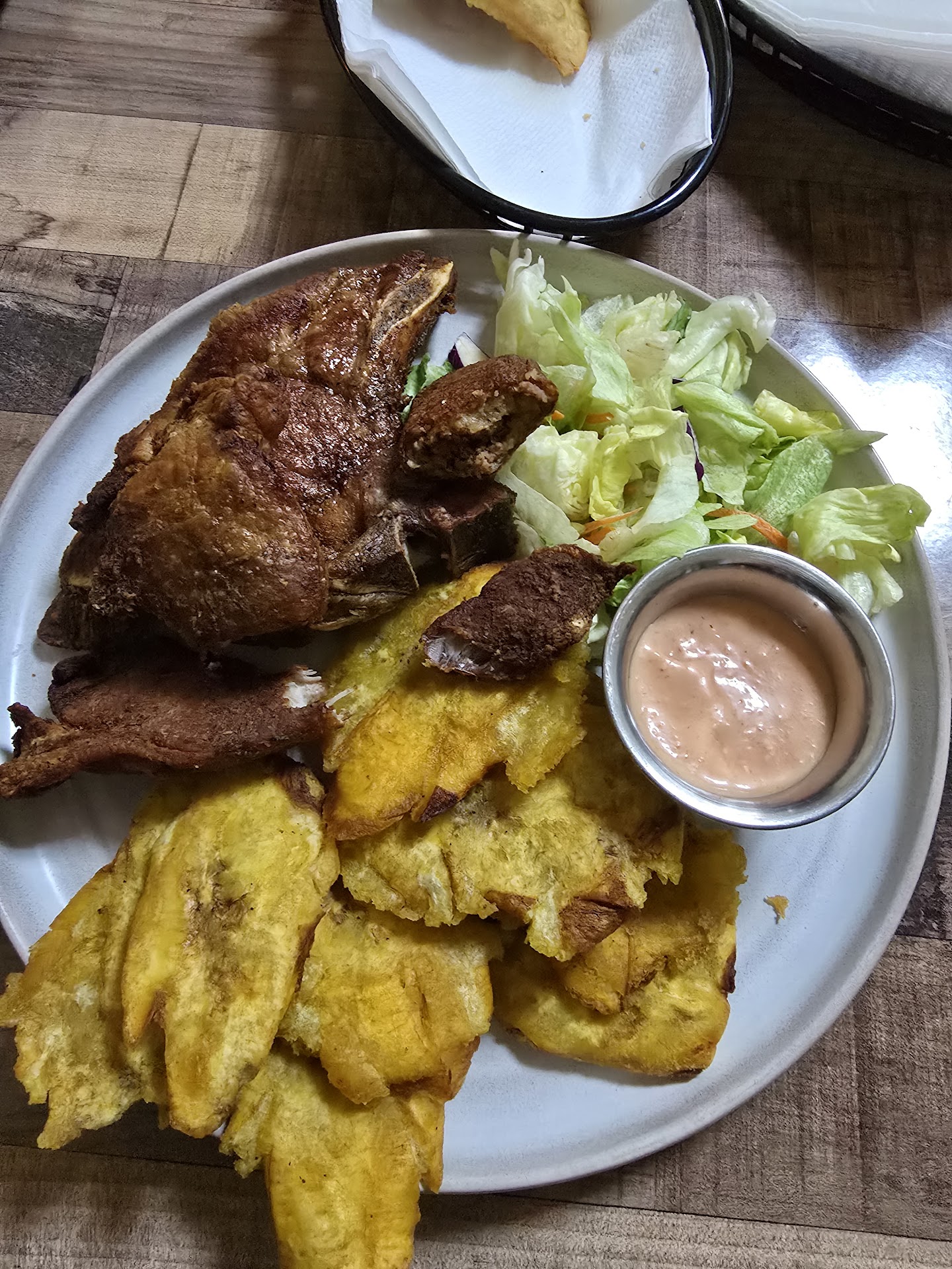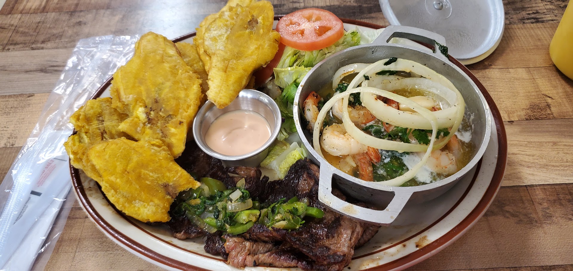 I was reviewing the menu and the owner walked up to me and showed me a picture of the special; steak and garlic shrimp with tostones and salad. Take my money! The steak was perfectly charred yet still red and tender on the inside topped with diced green pepper and cilantro, the shrimp were swimming in garlic butter and topped with a thick slab of seared onion. Hot tostones to scoop up the food and juices.