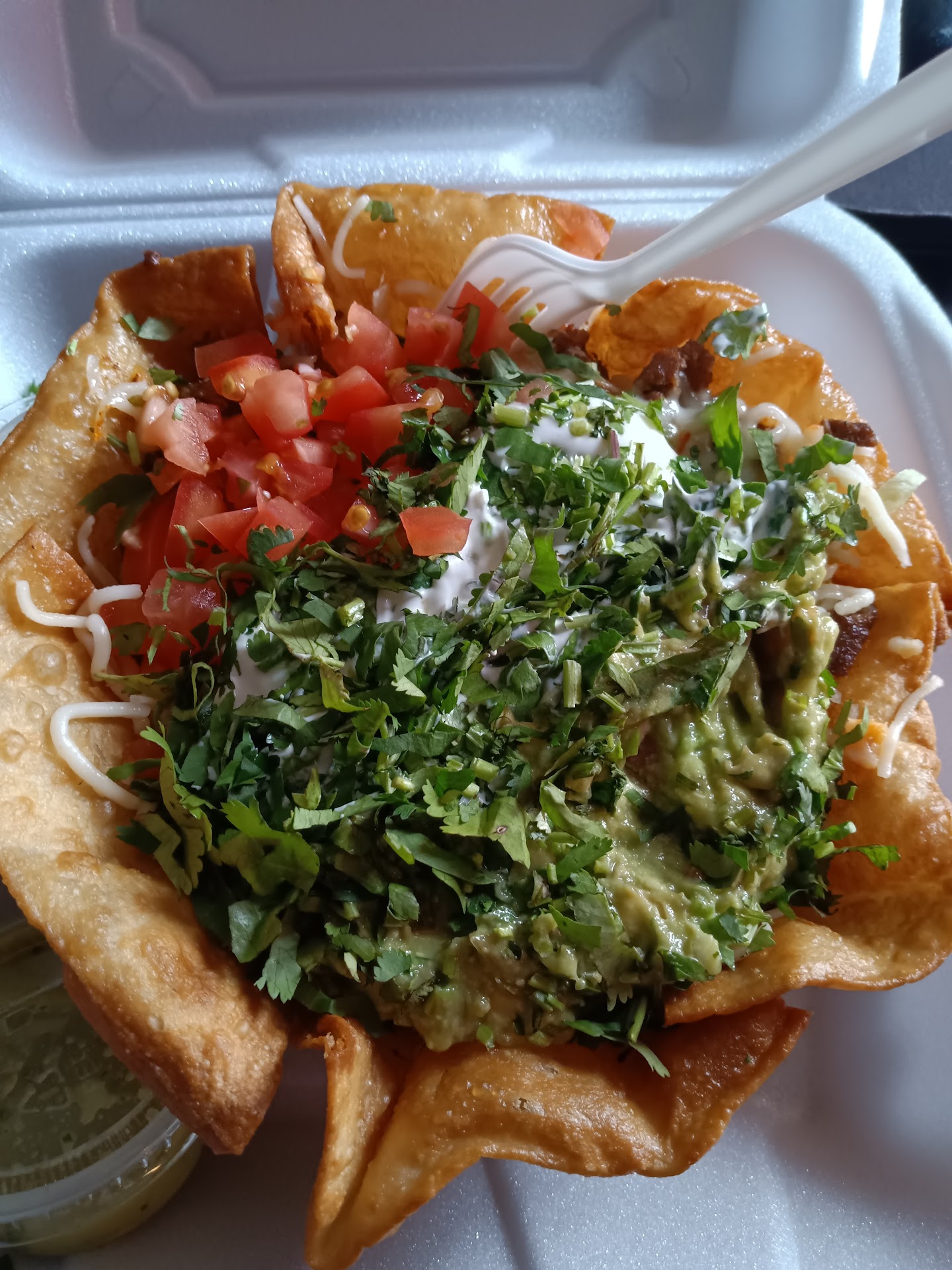When we got home, there was only 1 small container of guacamole in the bag and 2 HUGE burritos. Called the restaurant, they asked us to bring the order back with the receipt. Husband drove back since we are only 5 minutes away. He said they confirmed the order and gave him more guacamole. Guacamole was fresh. Well-balanced and Tasted delicious with the chips I had at home. When we unwrapped the burritos, they smelled good. They are big! They were wrapped in aluminum foil.