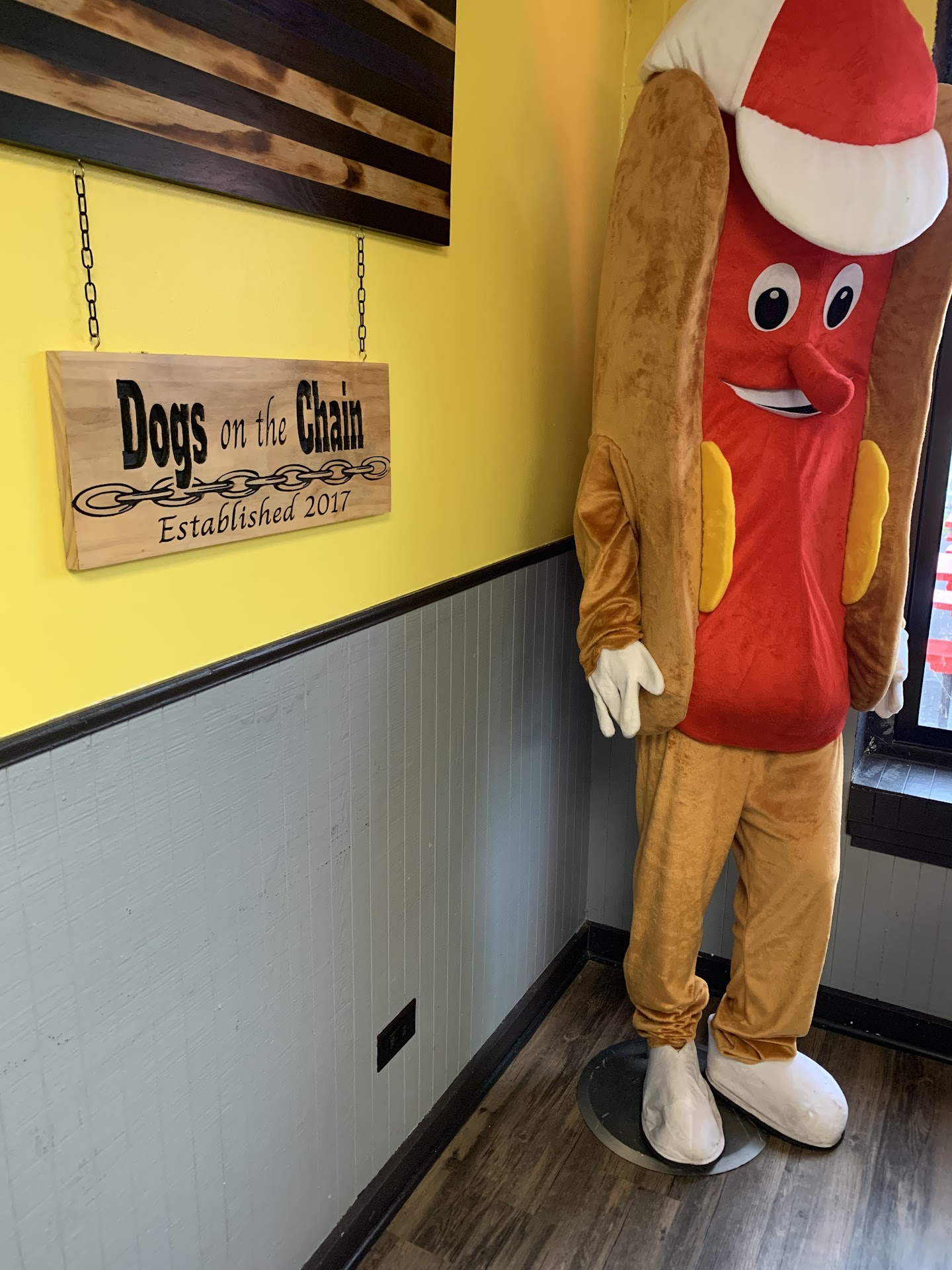 The Atmosphere: The outside is a very basic "Chicago style food" feel. As you walk in, there is a huge tank with several beautiful fish that swam around gracefully, they looked healthy and happy. A large human sized figure stood in the corner watching me with empty eyes, this hotdog suit was equally inviting and slightly unsettling (as any smooth cylindrical meat man would be as you consumed what you could only assume is his young offspring).