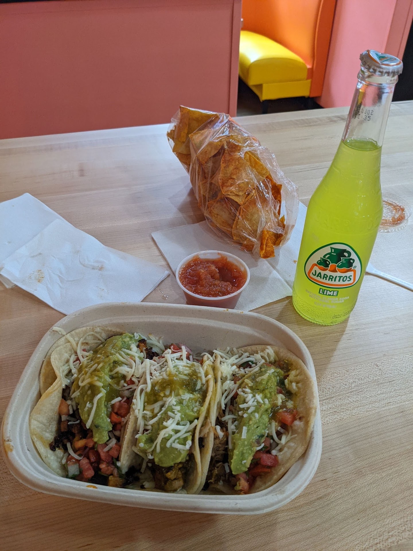 Read moreNot sure how to rate this place, ordering was sorta difficult because the board keeps switching and they don't have any other menus plus a slight language barrier and talking with masks made it a more difficult process than it needed to be. The tacos were really tasty I got 3 different ones plus chips and salsa just to try out a bunch of things. I asked to add pico, cheese and quac to each one, the extra cost for the quac would have been fine if it was a one time charge not for each taco they don't add enough for that. The salsa was warm, not spicy hot but actually warm which was strange. Didn't care for the chips either. Biggest issues is the cost, it was like $29 for this which is crazy high for what I got. Most taquerias I've been to I'd say that's $12-$15 worth of food at the most. I won't go back just because of how overpriced it was. I could grab 3 tacos and a couple beers for...