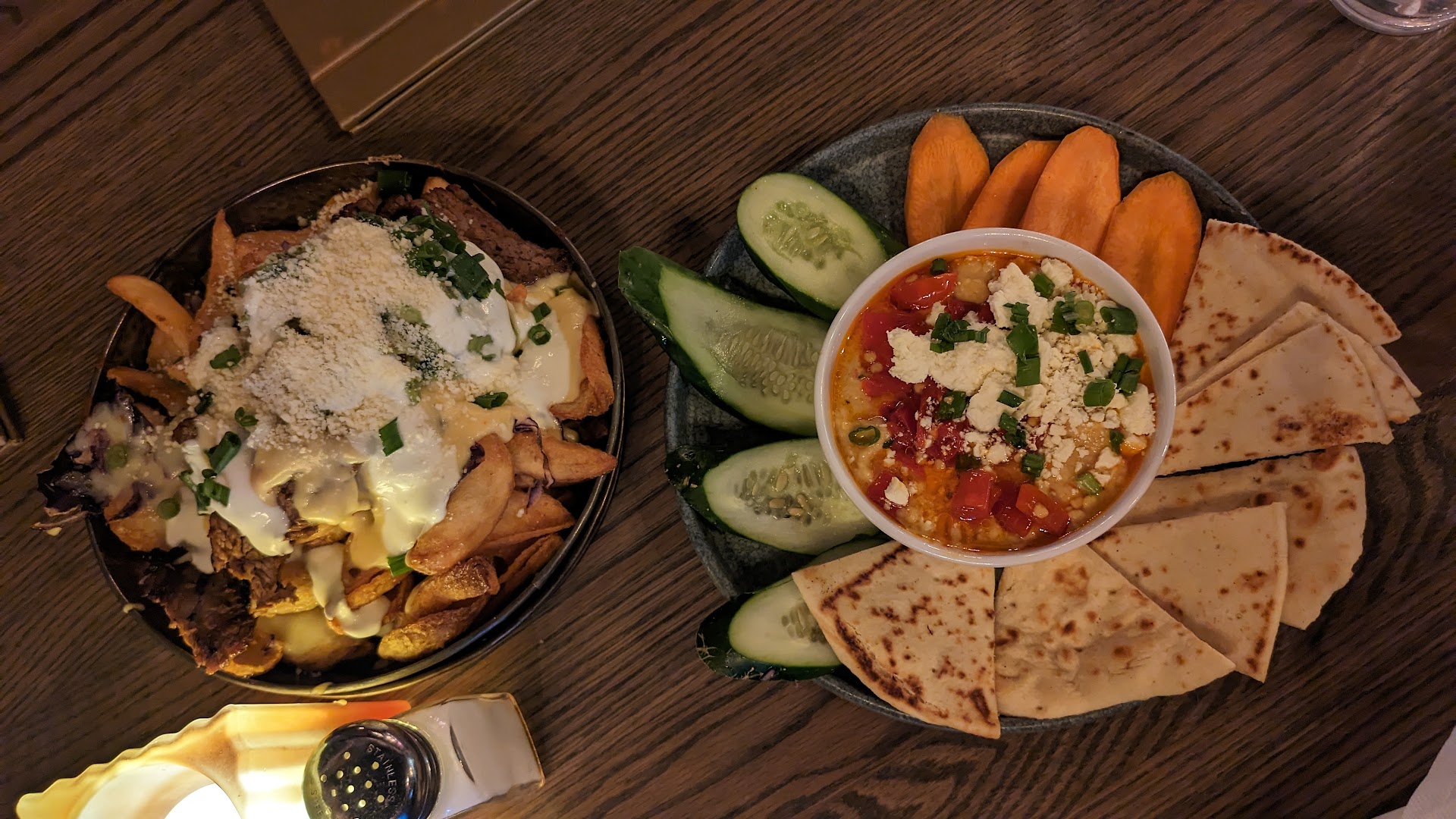 Read moreThey have an interesting spread for their menu. We got the carne asada fries and hummus to start. The carne asada fries came with three slices of steak. Could've used more. It was very good otherwise. It had queso, guac, some other toppings. The hummus was ok. A bit on the sweet side. Our friends got the Nashville chicken sandwich and Korean fried chicken pizza. We got the Cuban and the birria burger. The birria burger was very good, but a bit difficult to dip in the sauce. It came with a beef patty and shredded beef. The Cuban sandwich was stellar. Good portion of pork. Ask for extra pickles though. Their fries are almost like chips. Really good. Our friends said that the chicken sandwich was very good but the KFC pizza had a split opinion. We got the bubble waffle dessert and gelato. The gelato was just standard ice cream. The bubble waffle came with ice cream, cheesecake bites, peanut butter cups, sprinkles, and chocolate sauce. It sounds crazy but I think they sort of missed the mark with the bubble waffle on flavor. I would get the banana split instead next time. Still, excited to go back again and try other items. The...