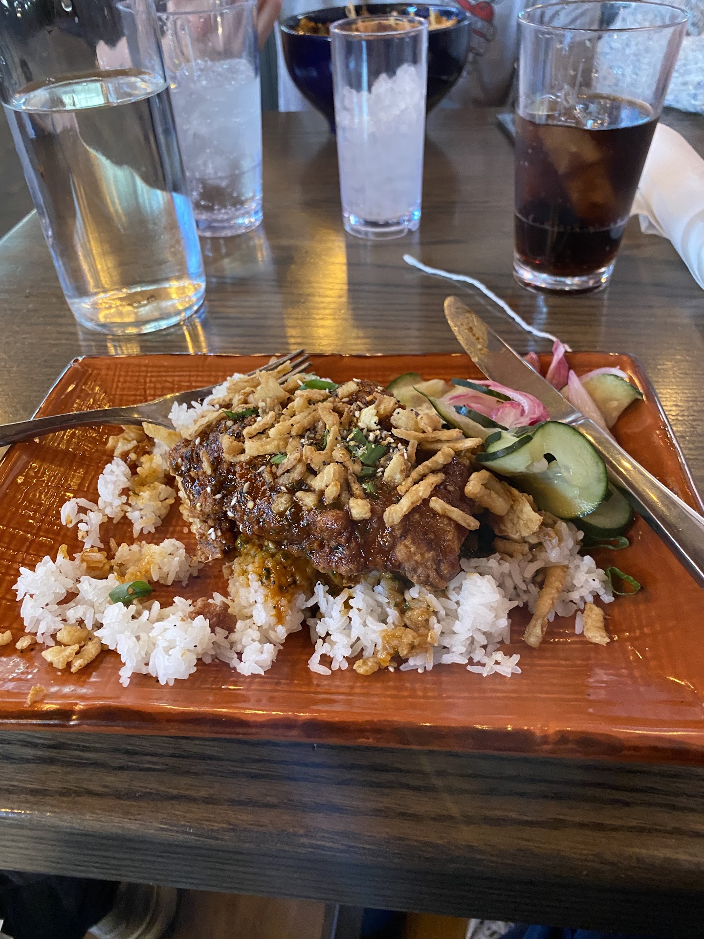 My Thai Chicken plate was good. I didn't expect a huge parm-sized breast, but it was crispy and the the spicy-sweet sauce was really good. The pickled cucumbers & onions accompanying it had seen better days. Probably saw a better yesterday. The limp, ragged slices betrayed having sat around a long time in the kitchen.