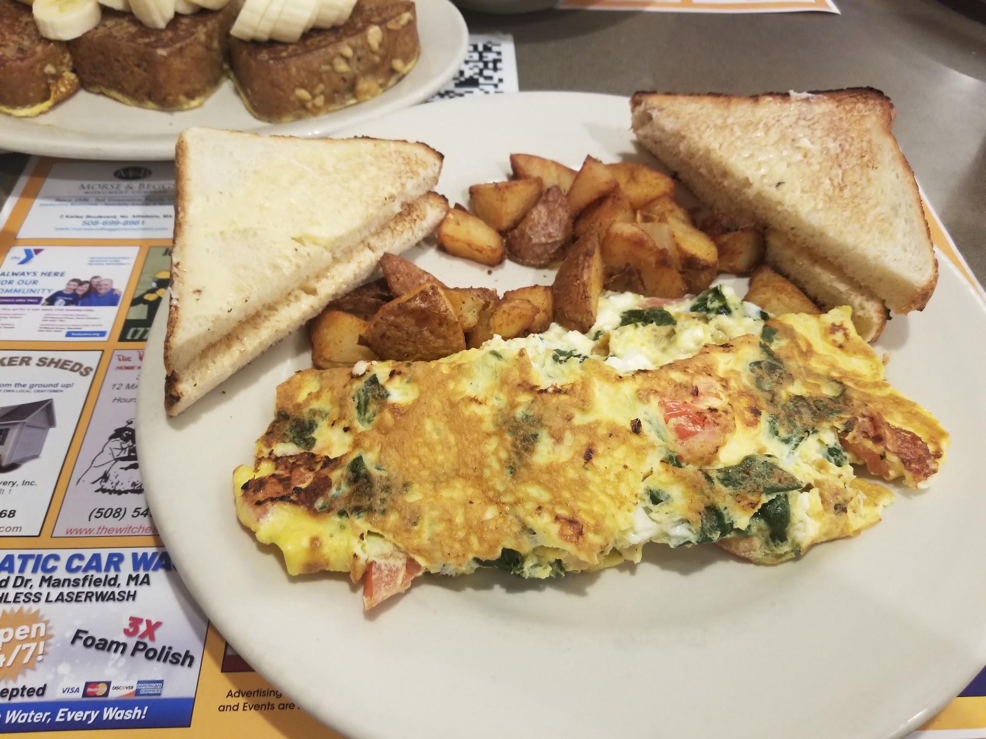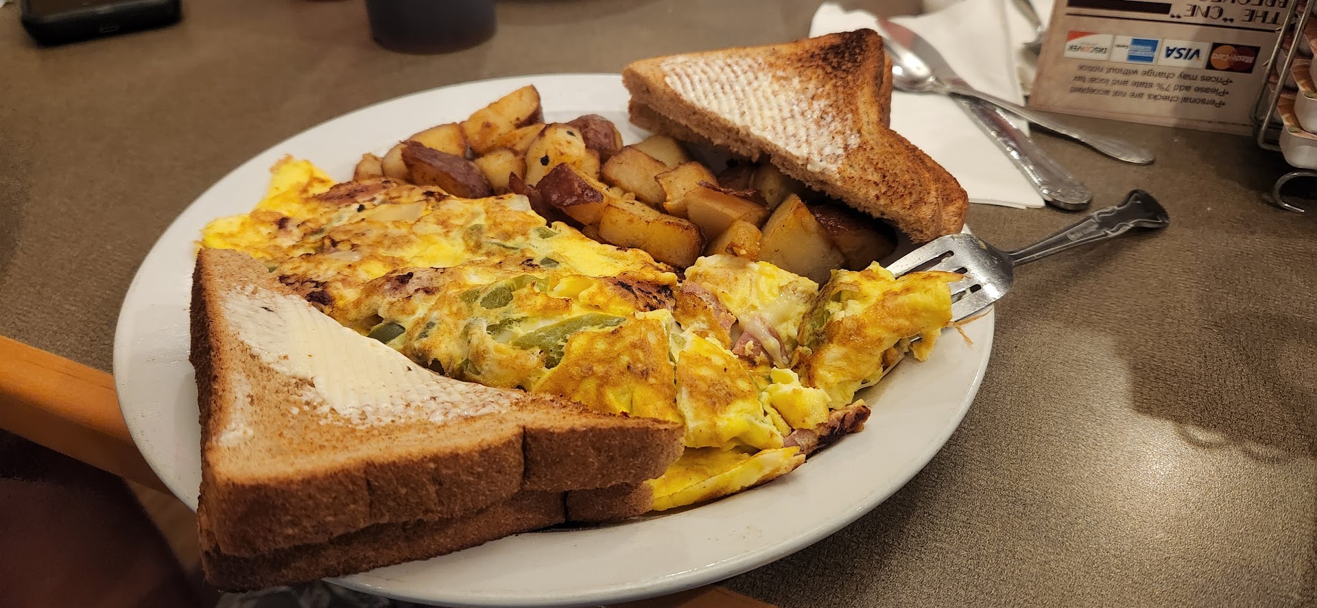 Read moreI really wanted to give a higher score but some large things stuck out to me and I just couldn't. The staff was very overwhelmed and disorganized right from the minute we walked in and gave our name for a table. I was in a party of 5 so I knew waiting for a table would be a definite. I was fine with waiting but it became clear early on that the person talking names was unclear on the sections and began overloading one waitress. We were sat after maybe 10-15 minutes in the already overwhelmed section. Our waitress was very nice but far to busy to handle a party of our size. We were forgot about on more than one occasion and for a long time before being able to order. We finally had to stop another employee to have them round up our waitress and have her come back. Even after the other employee asked her to check on us we still didn't see her for another 10 minutes. Our food arrived in an appropriate amount of time and everything was piping hot. The omelets were very good and full of toppings and lots of cheese. I had banana pancakes that we very dry and disappointing. The home fries were the star of the meal and I could eat them all day. Prices were very reasonable considering the size...