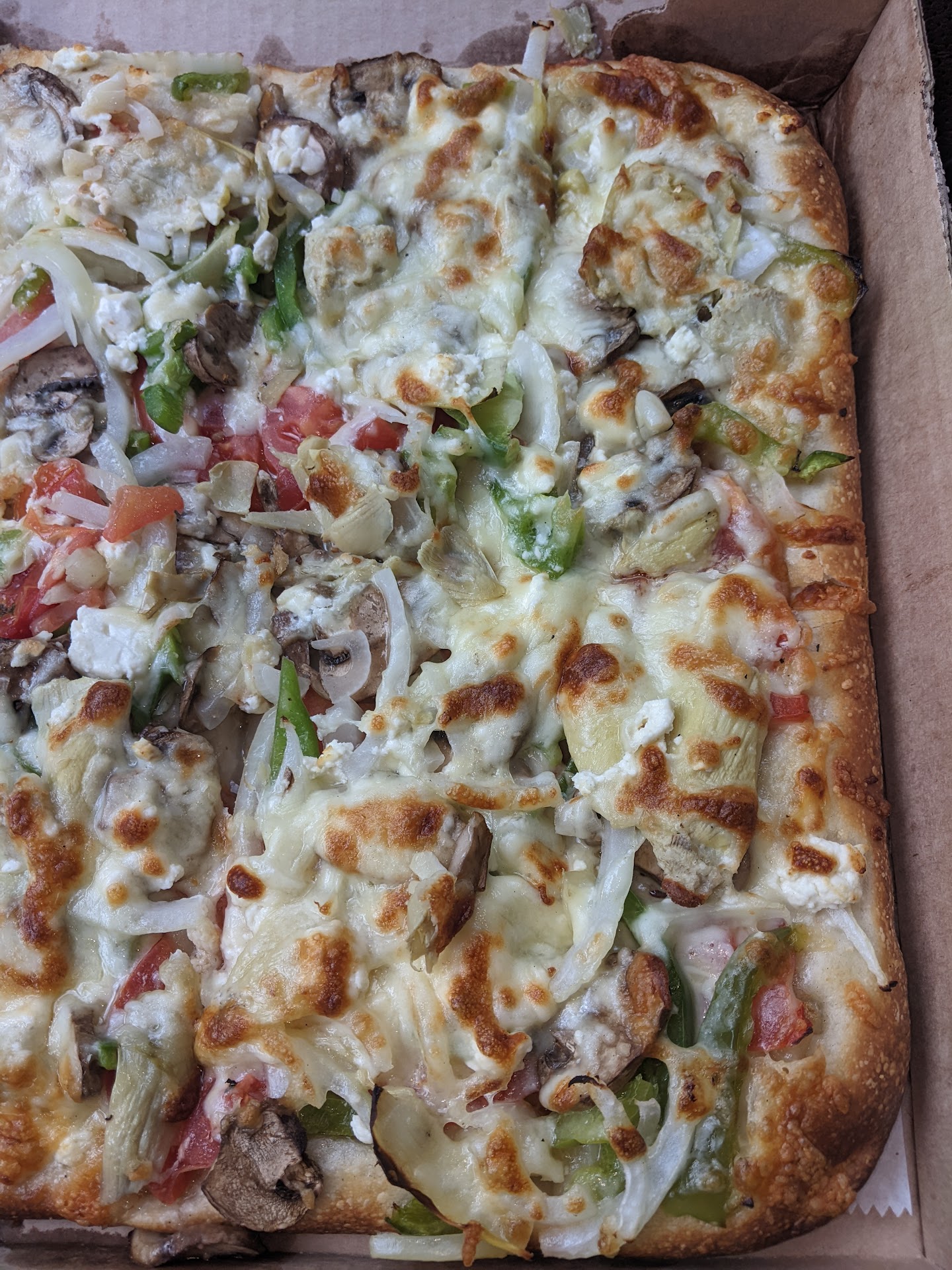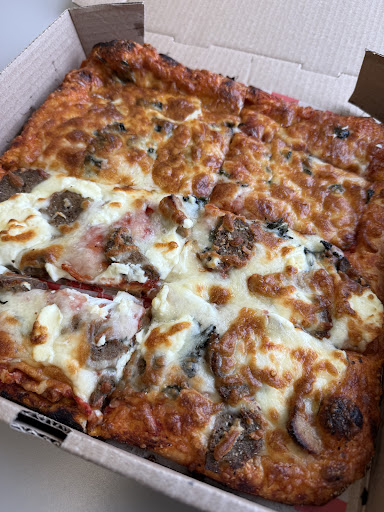 The best pizza I have ever had period. It is a square pizza with a medium thickness crust. The key is the ingredients are fresh. The veggie pizza is my favorite. It has white sauce instead of red. Bronzetti is such a custom friendly place that he knows I like artichokes on the veggie pizza so he carries them just for customers like me that want them.(see my photo of my veggie pizza with artichokes) They aren't standard on anything he cooks. He has great wings and his salads feed a person for 2 days or a family of 4 with pizza. He has great subs too. Basically you can't go wrong. Try it and you will never get pizza anyplace else. I drive 45 minutes just to get 2...