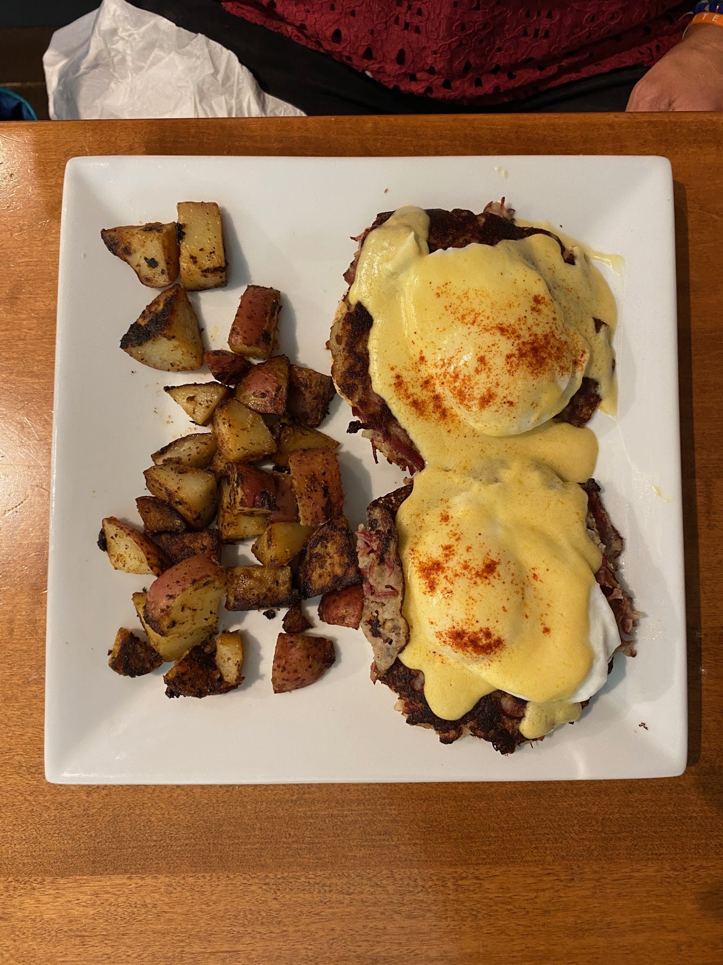 My mom ordered the Irish Deluxe benny and was super impressed with the quality of the English muffin. I had their corned beef hash which came with potatoes, toast, and two eggs. The corned beef hash was super unique and not like any hash I've had before. The pancake was slightly undercooked, but I took it home and heated it up in the microwave the next day and it was absolutely delicious.