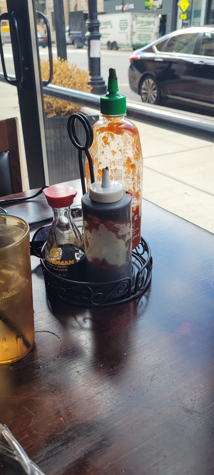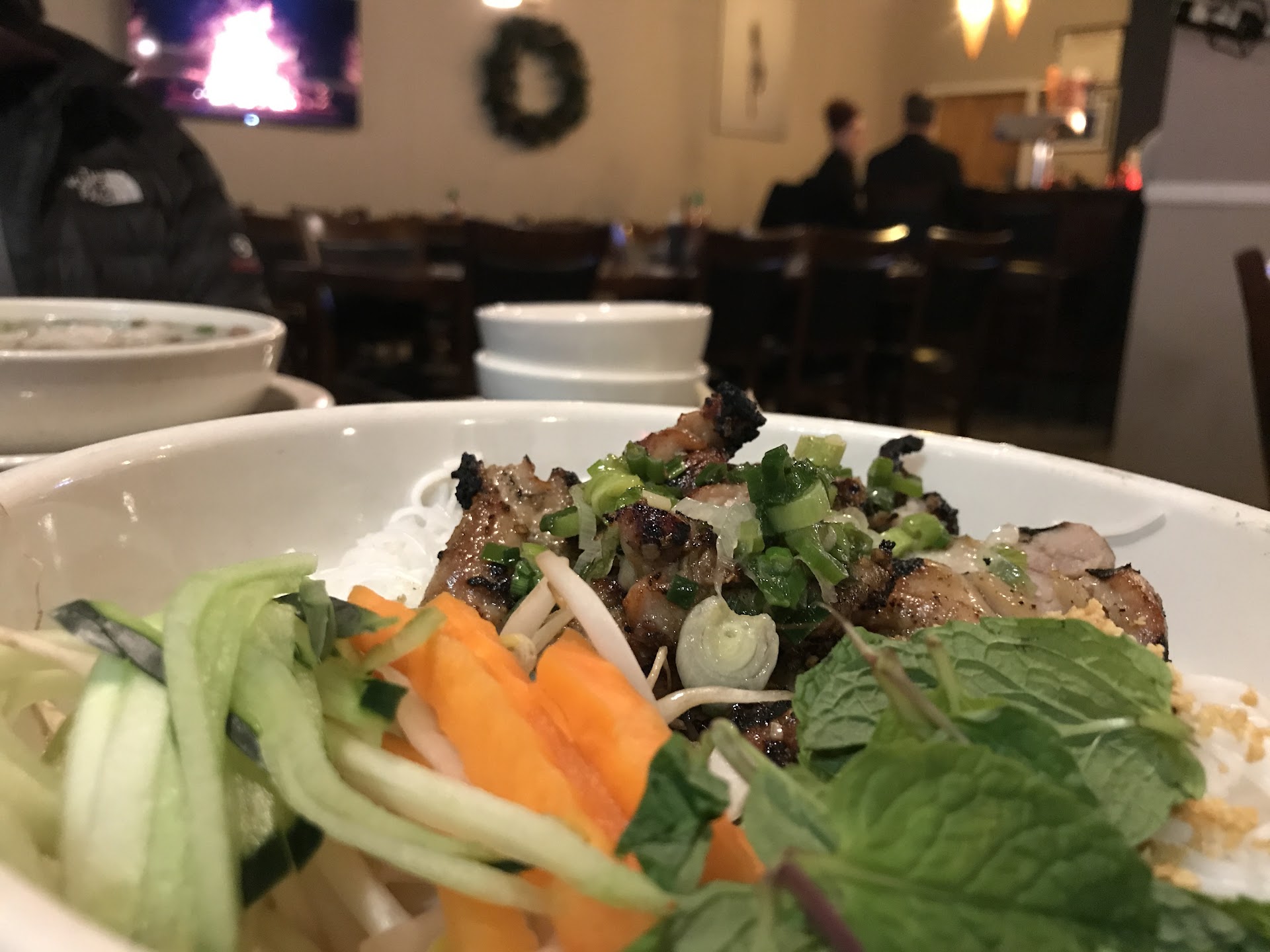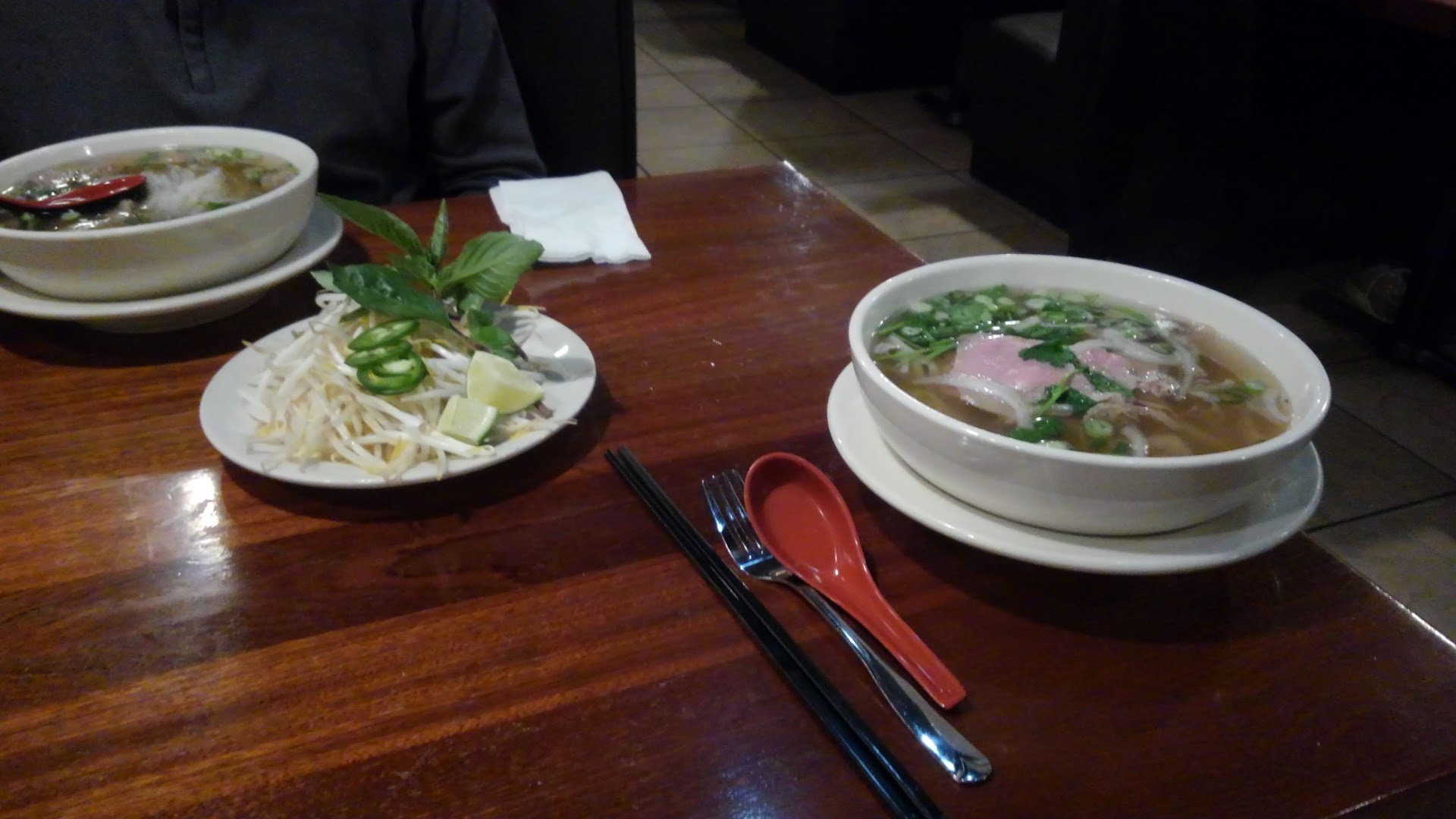 Back to the service... We were studying the menu and the waitress walked up and asked if we were ready to order (in a tone as if she had been waiting on us, even though she hadn't been to the table before and hadn't even asked for a drink order (and never did.)) I said we would like an order of spring rolls, and asked my husband if he had any questions about the menu, but she was already walking away, and from behind me said "so just spring rolls." We waited a very long time for her to return or for the spring rolls to arrive, and finally a young man who was cleaning the table next to us asked if we were ready and went to get her. We ordered pho. When the spring rolls arrived, she placed plates in front of each of us and then put the dish with the spring rolls on the corner of the table next to my husband instead of in the middle. She obviously knew we were sharing, and I had ordered them, so she puts them far out of my reach. ? When we didn't eat them all, we put the plates on the edge of the table so they would pick them up. On a pass by, she took the dish with remaining garnishes from the center of the table and left the two plates that we put on the side. (The friendly young man took them later.) When the pho arrived, she put my husband's bowl sort of in front of him, but put mine on the very edge of the table. See photo, that's where she set it. ...