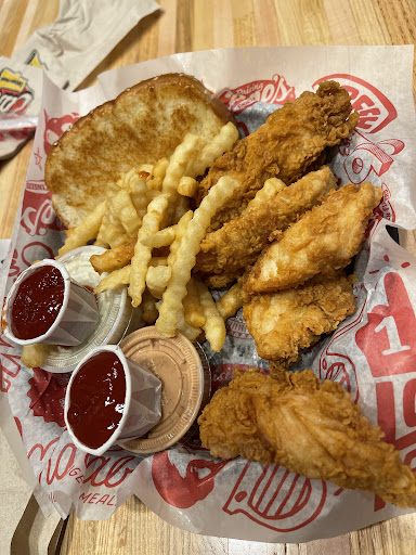 Read moreFirst thing I smelled when I walked in was either some chemical or raw potatoes. Not off to a great start imo. First time ever at any Cane's and the menu item was underwhelming since it only consisted of chicken tenders, crinkle cut fries, coleslaw, chicken sandwich and cane's sauce. No flavor variation on the tenders nor fries. Their combo was flexible enough where if I didn't want the coleslaw, they gave me extra fries. Staff was really friendly and had a great vibe among one another as well. Speed of service was within 1 or 2 minutes due to low variation of food.