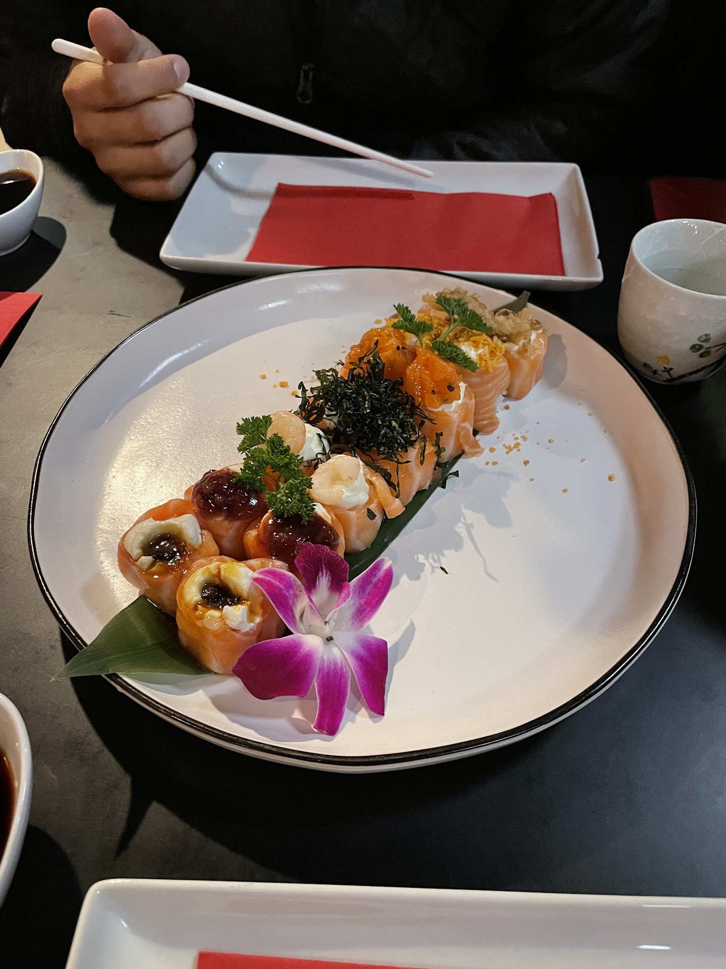 Seated at the way back corner when there was room elsewhere It took over 10 minutes for a simple order of coke to arrive at my table, add another 5 minutes and came my sake which btw mid. Two waitresses waiting on multiple tables and other waiters sitting around laughing or talking while they could have helped While the waitress was kind, you could tell she never tried any of the food there so that right there concerned me when I asked if she recommended the tuna or the salmon carpaccio - all she could respond with was āthey look like the pictures, if you want all the foods will look like the picturesā Ended up ordering their tuna carpaccio - tuna tasted not fresh, it was drenched in olive oil and capers and thatās literally all you could taste. I tried eating a couple of pieces and just couldnāt do it. Now when I ordered their mains, everything in the description had cream cheese, so this was on me for not reading their menu and assuming that they had traditional sushi rolls or even special rolls WITHOUT cream cheese, you know⦠like any other restaurant would? But thatās okay. what really bugged me was it didnāt come with any ginger or wasabi, nothing to cleanse your palate We didn't have a small sauce bowl to put our soy sauce in (funny itās a sushi place right..?) so I asked the server if they could kindly provide one, only for this guy to look at me like heās doing a huge favor and the only word he gave me was āsure.ā
