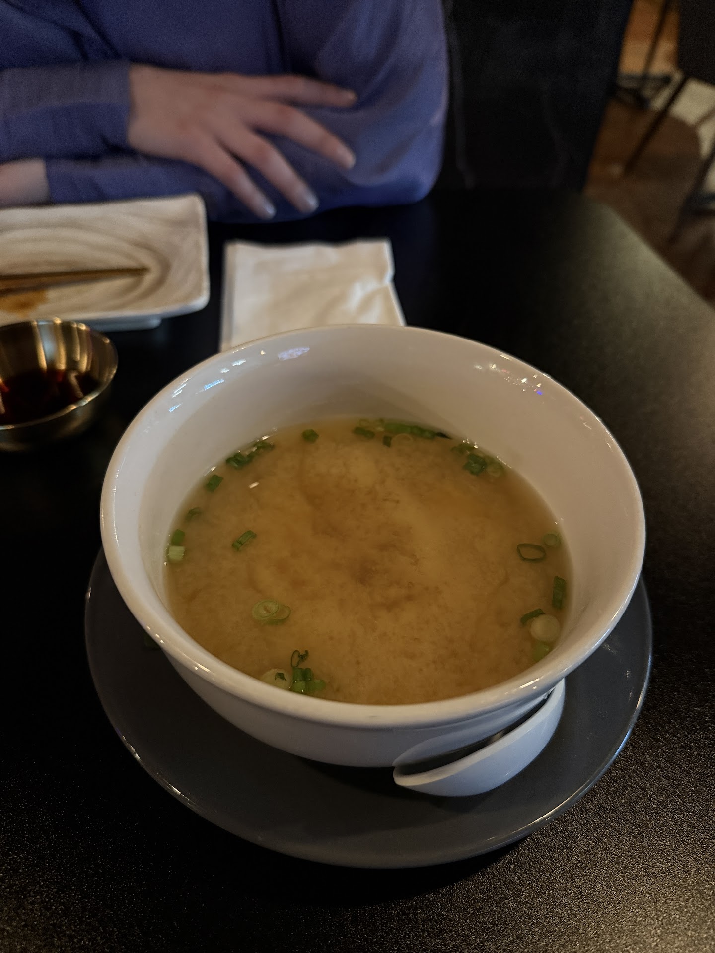 🍽️ Food & Drinks We began the meal with miso soup, which unfortunately lacked depth in flavor. The broth tasted watered down, and the large tofu chunks disrupted the balance of the dish rather than enhancing it.