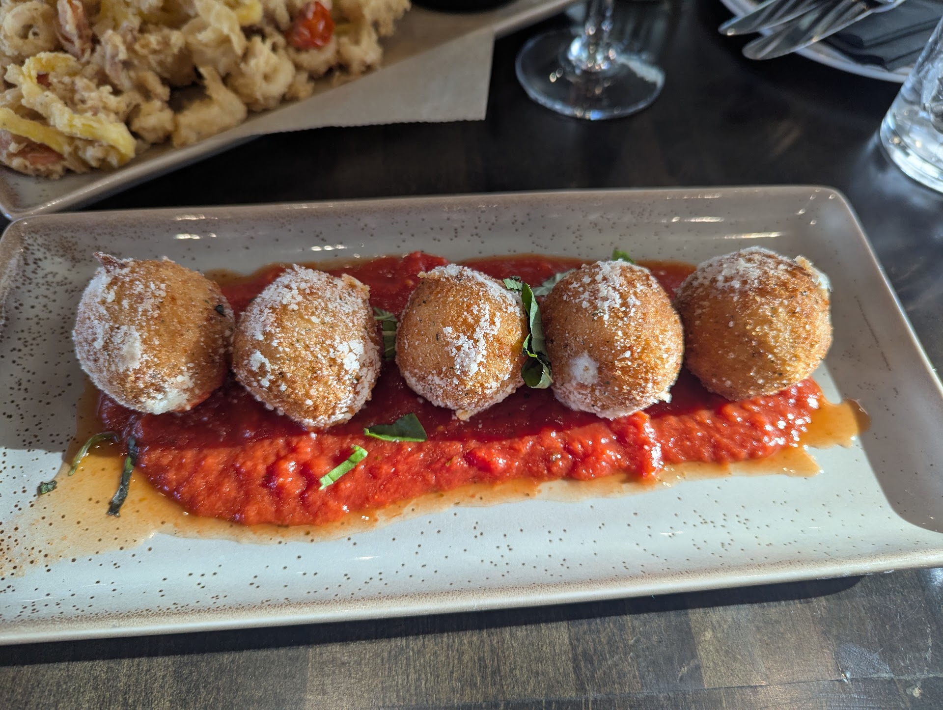 The food wasn't great. The biggest miss for both of us was the calamari app, which shouldn't be too difficult to score with. The calamari itself needed salt, and that was especially true because the marinara sauce was almost inedible. It was legit cold and tasted like it came out of a can. Really rough, and I think we ate most of the calamari just naked, which is not how nature intended. I did like the arancini (fried risotto balls). That also came with a marinara sauce but thankfully THAT sauce was actually pretty warm. Temperature matters. My chum also got the fish tacos and didn't mind them, but nothing here was noteworthy enough to recommend, honestly.
