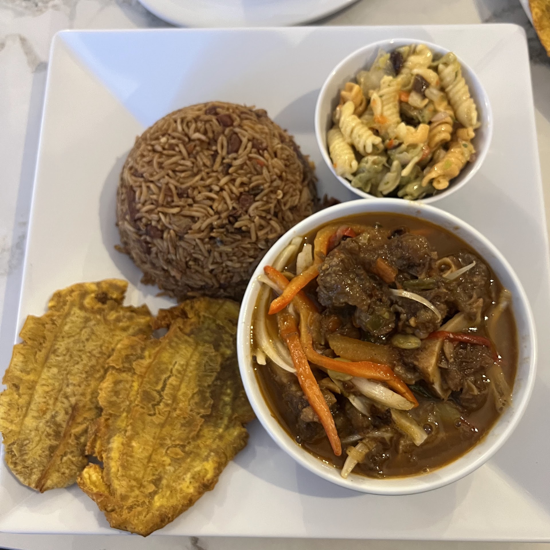 We ordered the oxtail (which comes with rice of the day—usually rice and peas—and two huge fried plantains), a side of salade russe (a potato salad with beets), and the House Marinade appetizer (we didn’t know what it was at first, but it turned out to be a delicious deep-fried fritter—crispy on the outside, soft and savory inside). Everything we ordered was absolutely delicious.