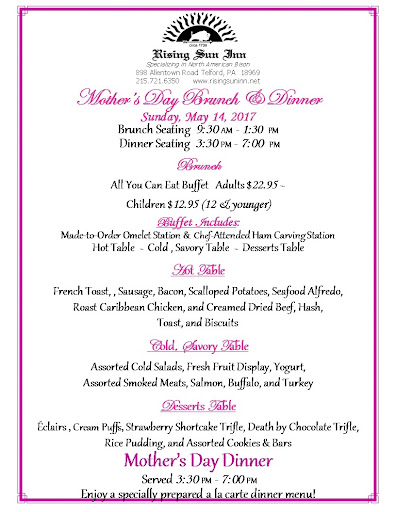 Read moreHIGHLY DISAPPOINTED. I made Mother's Day reservations for 6 people plus my 1 1/2 year old in a highchair 3 weeks prior to Mother's Day for 11:30 am. A week and a half prior, we had an additional family member who recently lost her mother add to our reservation. I called the restaurant immediately and unfortunately, the only time slot available for that many people for BRUNCH was 1 pm, last seating would be 1:30. When we arrived promptly at 1 pm, our table was not ready and was told to wait about 5 minutes. At 1:23 pm, we were finally seated and waited another 10 minutes for drink order. Then we were allowed to the buffet. WHAT A DISAPPOINTMENT. The buffet consisted of 2 very small tables, one labeled hot and one cold. NO food was labeled. An additional table off to the side for dessert was next to the staff (who knows if he was a chef?) tended omelet station. Their idea of a chef carved ham station was a small tray table with a heated lamp over a plate of sliced ham. I assume after 1 pm NOTHING was refilled. HALF if not more of the items listed on their Mother's Day flyer were NOT on the buffet. I posted a picture of the flyer that they advertised. The seafood Alfredo was completely picked over with no seafood- only essence of seafood flavor. The roasted Caribbean chicken was replaced by basic breaded chicken strips. There was nothing even close to what resembled salmon, buffalo and turkey. Since they are known for their American buffalo, it would have been nice to try that for a buffet costing $22.95 per person. I was so embarrassed in front of my guests for suggesting and booking the reservation at the Rising Sun Inn. To top it off, when I received the check, they charged me for children's portion ($12.95) for my 1 1/2 year old that ate one slice of brown pineapple. Needless to say, even though I am moving locally to the area, I will NOT be returning to The...
