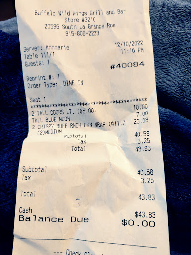 Read moreMy daughter was in visiting me from Indiana, and after 7 hrs of Christmas shopping we decided to stop in at the Frankfort Buffalo Wild Wings for a beer and a buffalo wrap befor calling it a day !!! Upon arriving,it was about 10 pm on a Saturday night... we were seated in a booth, and given 1 menu between the two of us from the hostess.Our waitress comes over and lays down one beverage napkin, as she takes our drink order... my daughter orders a Blue Moon, I, a Coors light draft. Upon arriving to yhe table my daughters orange in her beer was drenched in cherry juice. ( to lazy to cut a fresh orange,I guess) turning her $7.00 beer pink. When our wraps came our french fries, were covered in black pepper. What resturant puts black pepper on your fries ? I had to trade fries with my daughter,because I have diverticulitis and can't eat the black pepper.. Hers had alot less than mine did, and I was able to wipe it off with my fingers. I , myself ,ordered a second beer, I got a huff and puff from the waitress.Probably because she was ready to get her 2 tables closed out and be able to leave early on a Saturday night. At that point, needless to say, I took my time, and enjoyed my conversations and my beer. I closed out my tab at 11:16 ( resturant closes at midnight) I gave the waitress a $100 bill, she came back , slapped $56.00 on the table with no receipt. Well, I wanted a receipt, more huffing and puffing, and she slams it down the table. As I wonder about her math skills , she then walks over and slams .50 on my table and a dirty dish towel ,inwhich she left on our table as I was finishing up my beer. Its been a very long time, since I have been treated so disrespectful by a server in a resturant. I raised my daughters in the resturant and bar business, I know your attitude and personality go along way in your tips and every table should be treated with respect. Because of this employee, I will not be frequenting BWW in Frankfort. Her who attitude toward customers sucks! According to my receipt, there was only 1 guest also.. boy.. that must be why I only needed one beverage napkin, right Annmarie ? Also here the msth Annmarie $100-$43.83 leaves $56.15 not $56.50 I'm sure your register...