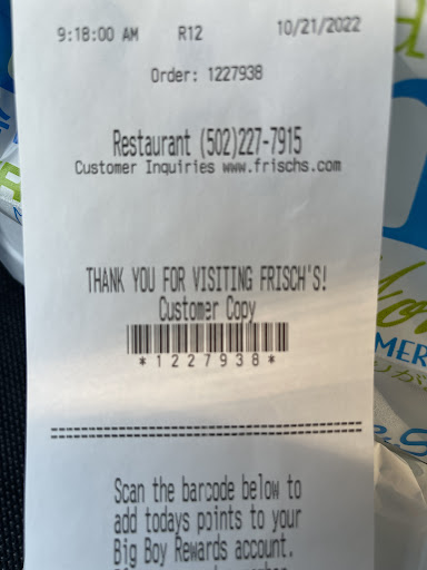 Read moreJust picked up a mobile app order at the drive thru. Which apparently is a no no. Since I have two small children in the car, I ordered ahead giving ample time to prepare the order, drive thru and pick it up. Easy right? Well it’s not. I was told to pull ahead by a very nice young lady when I stated I was picking up. Get to the window and the diva there proceeds to belittle me to everyone in the kitchen that I should have came in for this. Loudly, and so I guess I would become educated on what she wanted me to do. Again, carrying food and children was what I was trying to avoid. I guess grabbing a ready and sealed bag and sticking it out a window with a thank you, or have a nice day was just too much for our customer service ignorant Karen, as all I received was an arm, and a slammed window as she walked away, Now Frisch’s, I did you a favor ordering ahead rather than ordering at your drive thru so you didn’t have to prepare multiple meals as I sit there holding up your line. But what I got in return was a rude, again, service ignorant, individual there being the face of your business. If the ability to order ahead, and handing off the order is too much for you, perhaps don’t offer it. If handing me a bag at the window is in fact too much, tell me that. So I know what to expect and I’ll plan better. Don’t just slam a window in my face and walk away. Order, drive up, grab, drive off. That was intent. I sincerely apologize for totally upending that poor girls day...