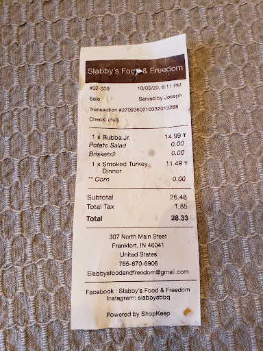 Read moreHighly recommend! Tried Slabby's for the first time after a recommendation from my sister. My parents and I ordered takeout: 1 Jr. Bubba dinner with 2 orders of brisket and a turkey meal. We tried sides of creamy corn salad, potato salad, cornbread, and pickled onions. Both meats were excellent and juicy. We got the brown sweet sauce and the black Worcestershire sauce, equally delicious. Three of us ate well for $38. The owner took me back to see his new smoker and his setup out back. It was so clean and interesting! I hope he is able to have great success in Frankfort!