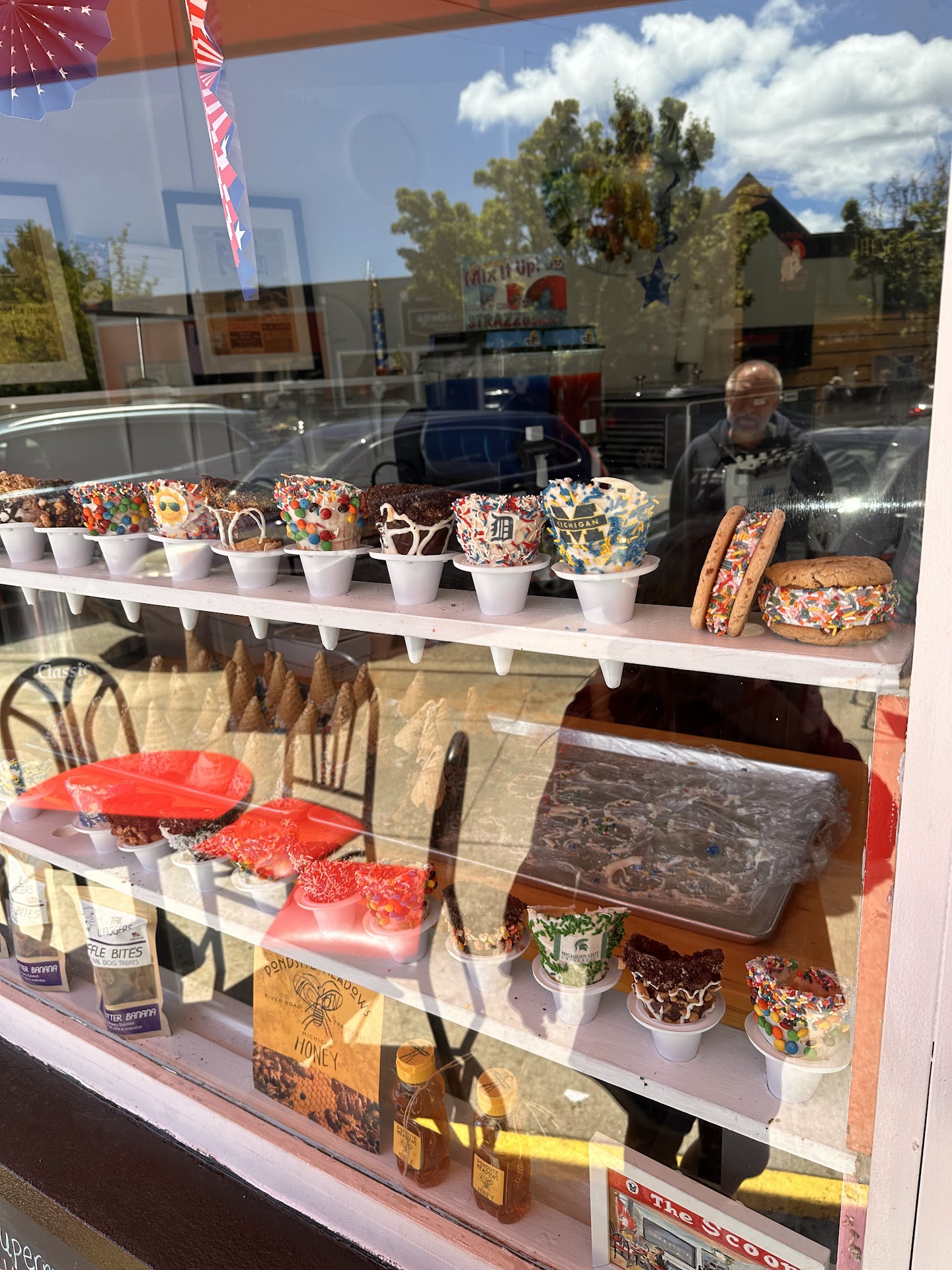 I was pleasantly surprised how reasonable the prices were given the location. A very friendly (and patient) lady was taking orders at a walk-up window. There wasn't an option to go inside of The Scoop. For those visually inspired people this might be a downfall since you're unable to see all the buckets of ice cream. A large variety of ice cream flavors are posted on a window as well as on a board.