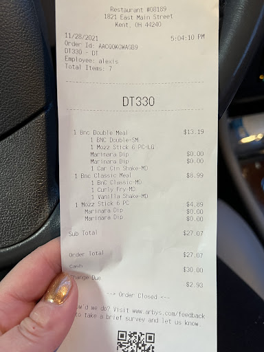 Ā Ā Ā Read moreStopped here to grab a quick sandwich and mozzarella sticks and was not pleased at all with the food. The people over all were nice but seemed a bit unorganized. They pulled us forward because they were waiting on our mozzarella sticks and when we got them only 2 were fresh out of the 12 and they tasted burnt like the oil was old. I am super glad that I check all my sandwiches from most restaurants. When I turned my sandwich upside down the bun was covered in mold. HIGHLY unacceptable because this can get people sick. Will not be returning to this Arby's ever again and will be submitting to corporate as well about the food standards. Have seen some bad reviews of food quality so would not recommend until...